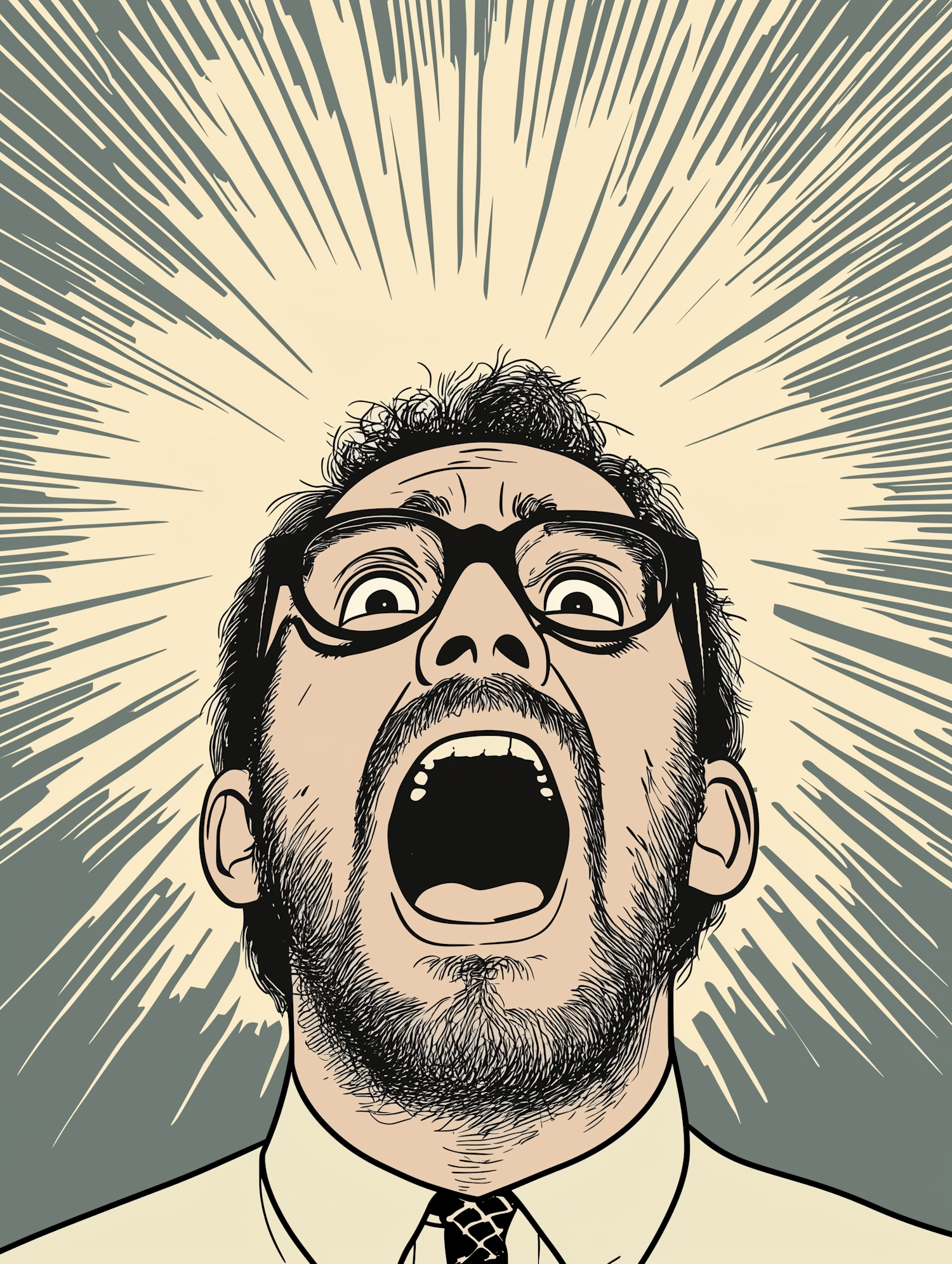 Illustration of a man shouting with dynamic lines radiating from his head, creating a dramatic and intense comic book style.