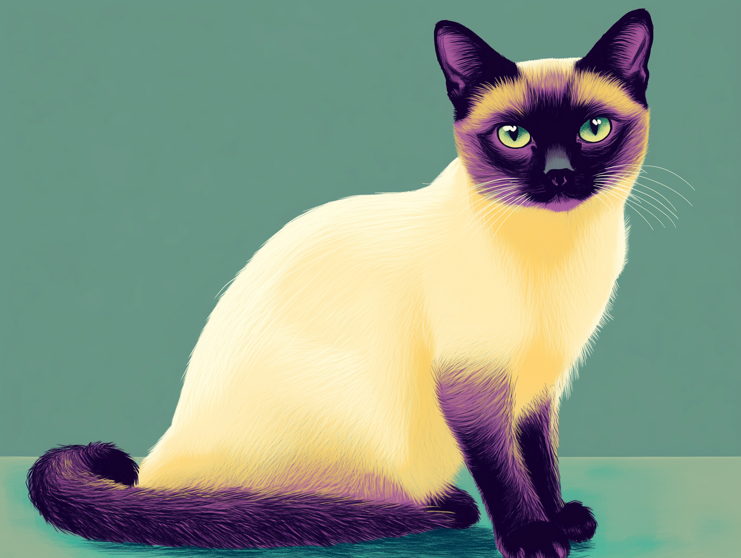 Beautiful digital illustration of a Siamese cat with green eyes, cream fur, and dark points, sitting gracefully against a green background.