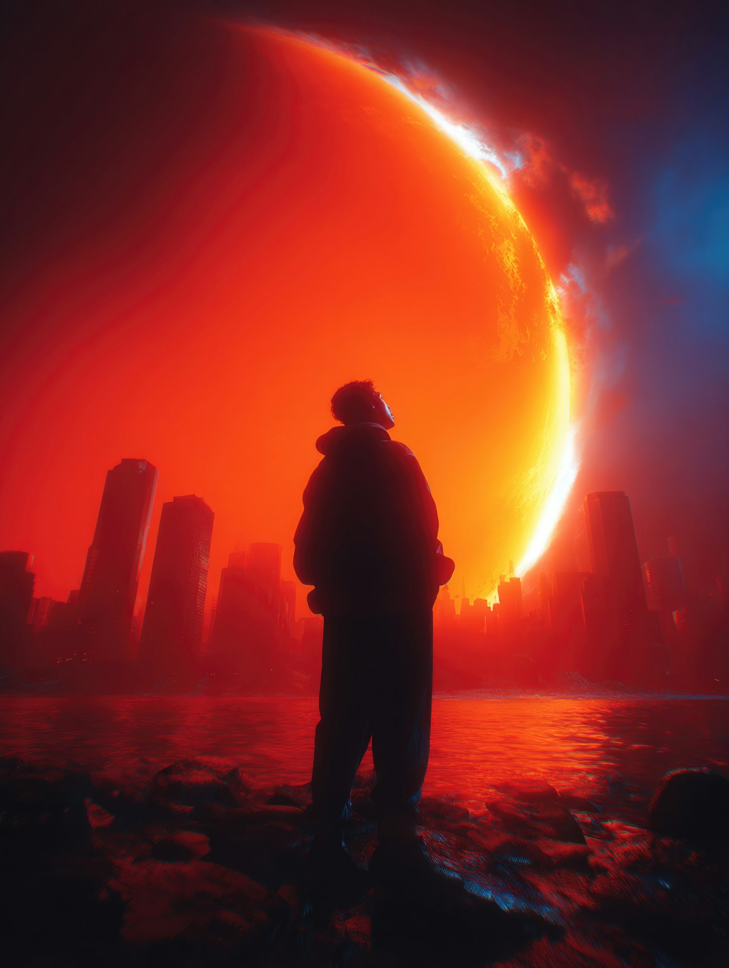A silhouette stands near a waterbank with a glowing red celestial event lighting the city skyline in an awe-inspiring view.