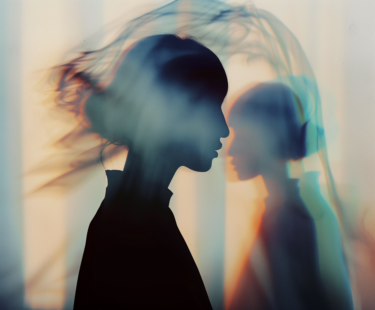 A silhouette of a person with dynamic lighting and overlapping shadows, creating a dreamy and artistic visual effect.