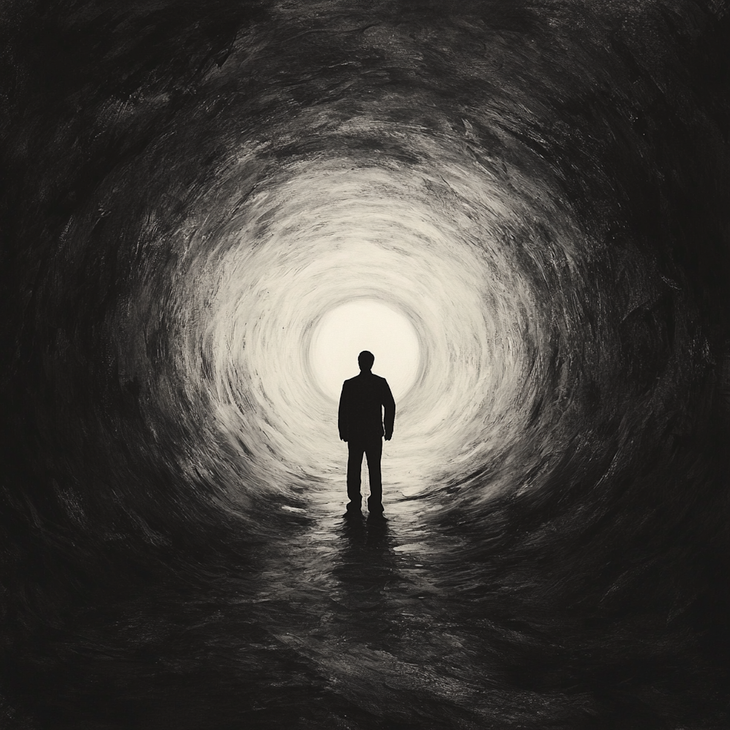 Silhouetted figure in a suit stands in a swirling black-and-white tunnel, facing a bright light, symbolizing hope or transition.