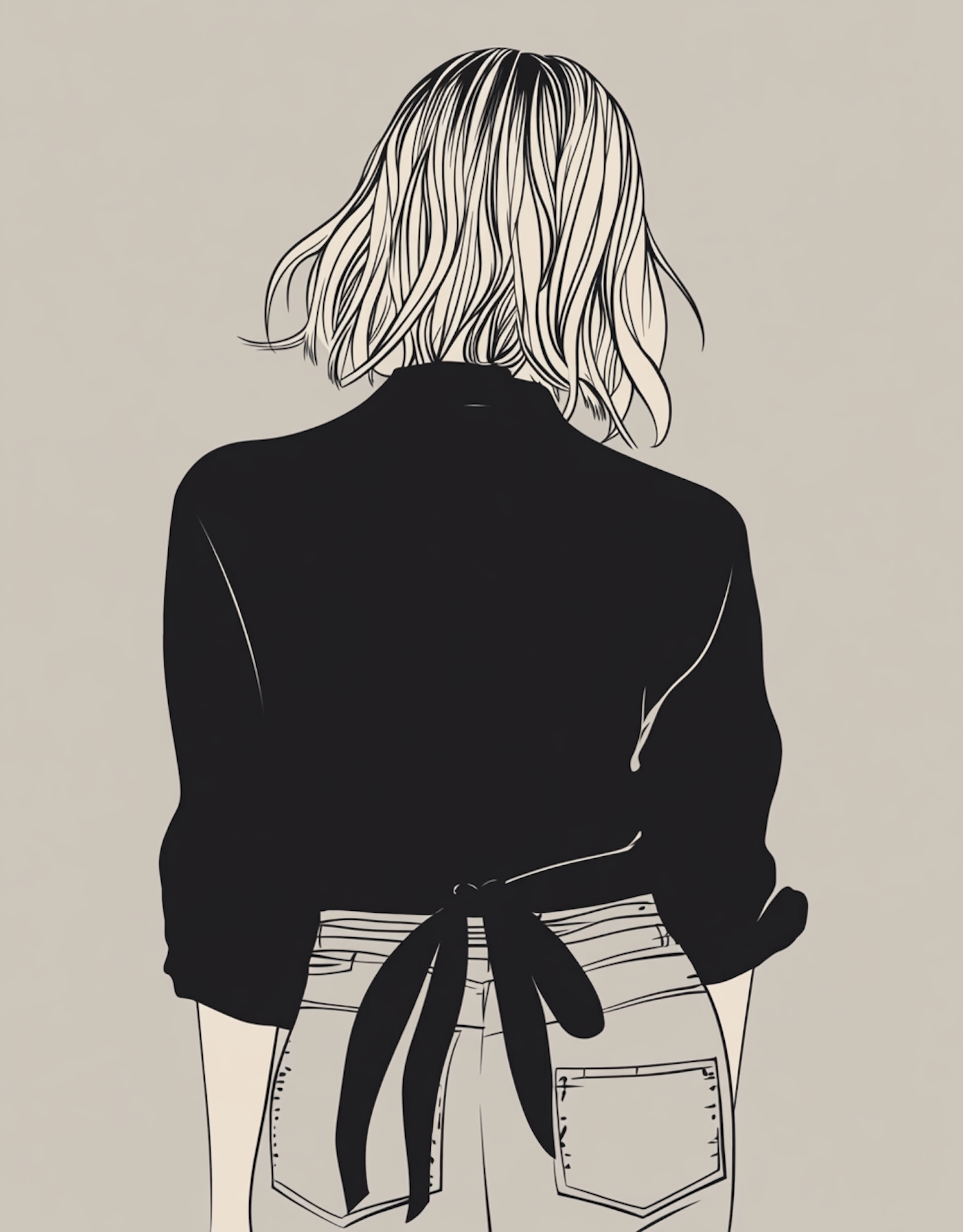 Stylized illustration of a person from behind with wavy hair, black top, and jeans. Minimalist design with a neutral background.