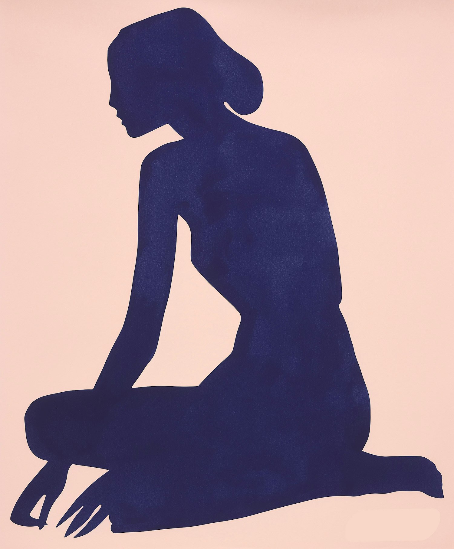 Minimalist navy silhouette of a kneeling woman against a beige background, showcasing elegant form and posture.