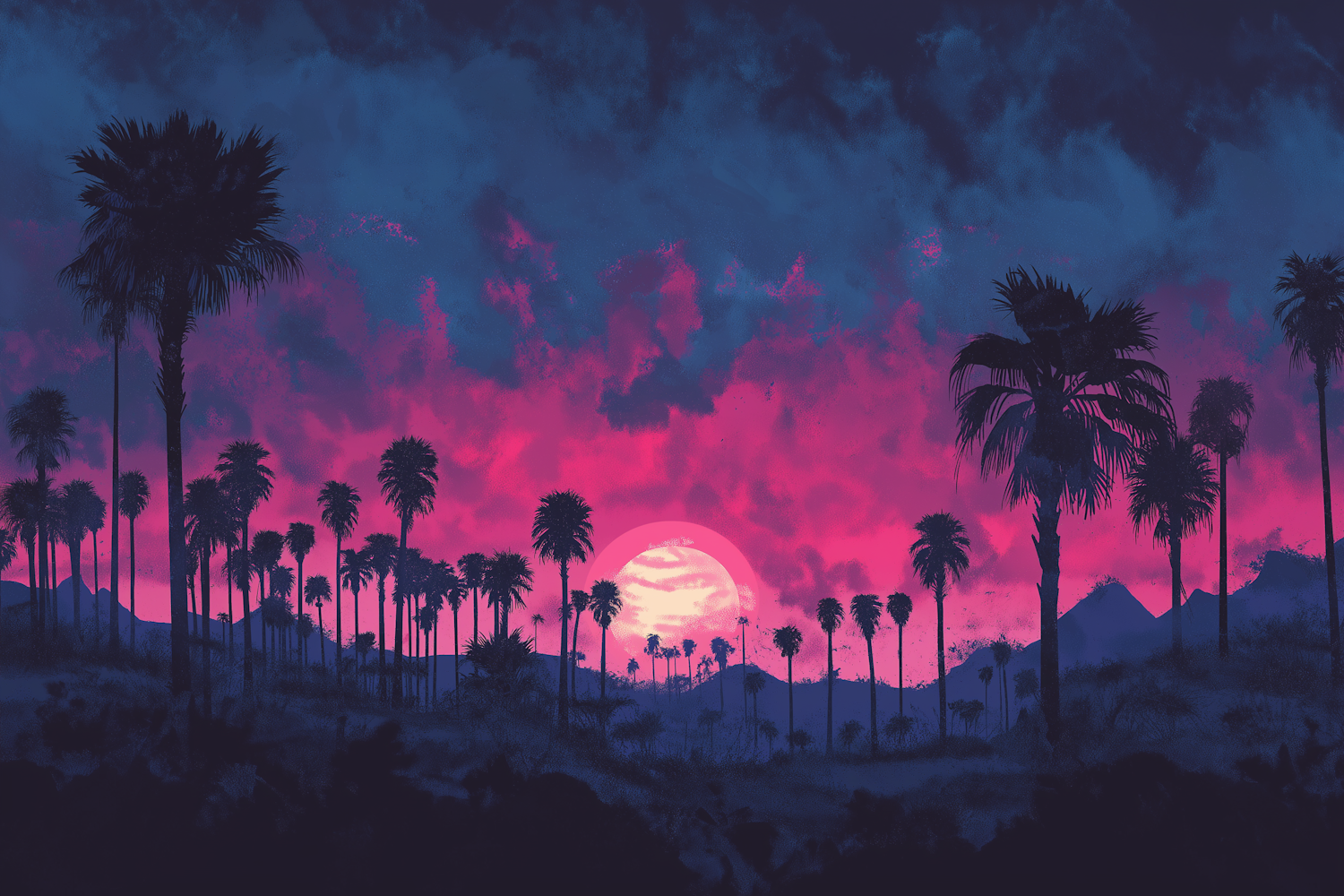 Silhouette of palm trees against a vibrant pink and purple sunset sky, creating a serene tropical landscape.