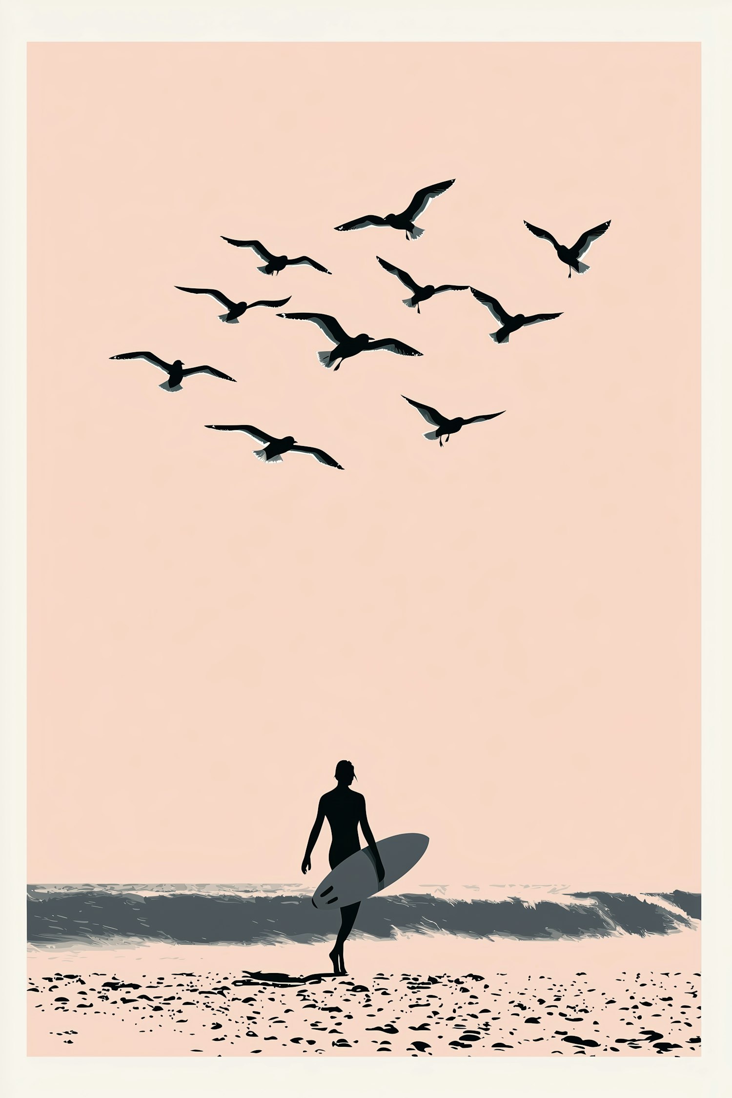 Minimalist beach illustration with a surfer silhouette and birds against a pastel pink sky, evoking tranquility and connection with nature.