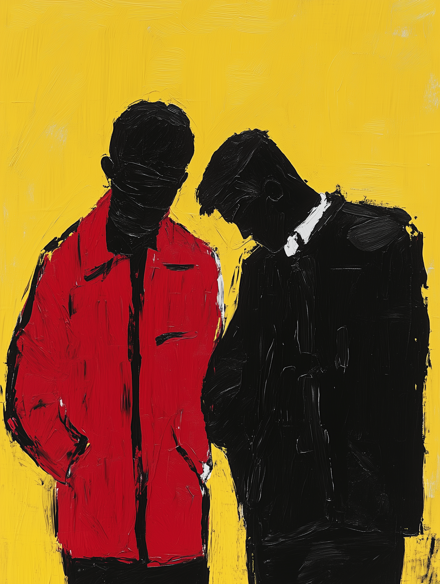 Abstract painting of two figures in red and black against a yellow background, featuring bold brushstrokes and minimalistic design.