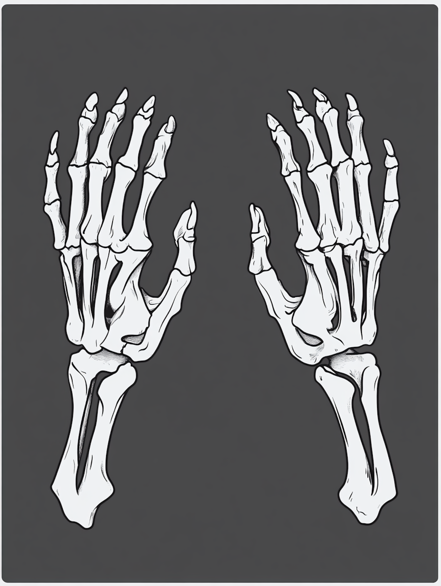 Realistic illustration of two skeletal hands on a dark background, showcasing detailed bone structure and anatomy.