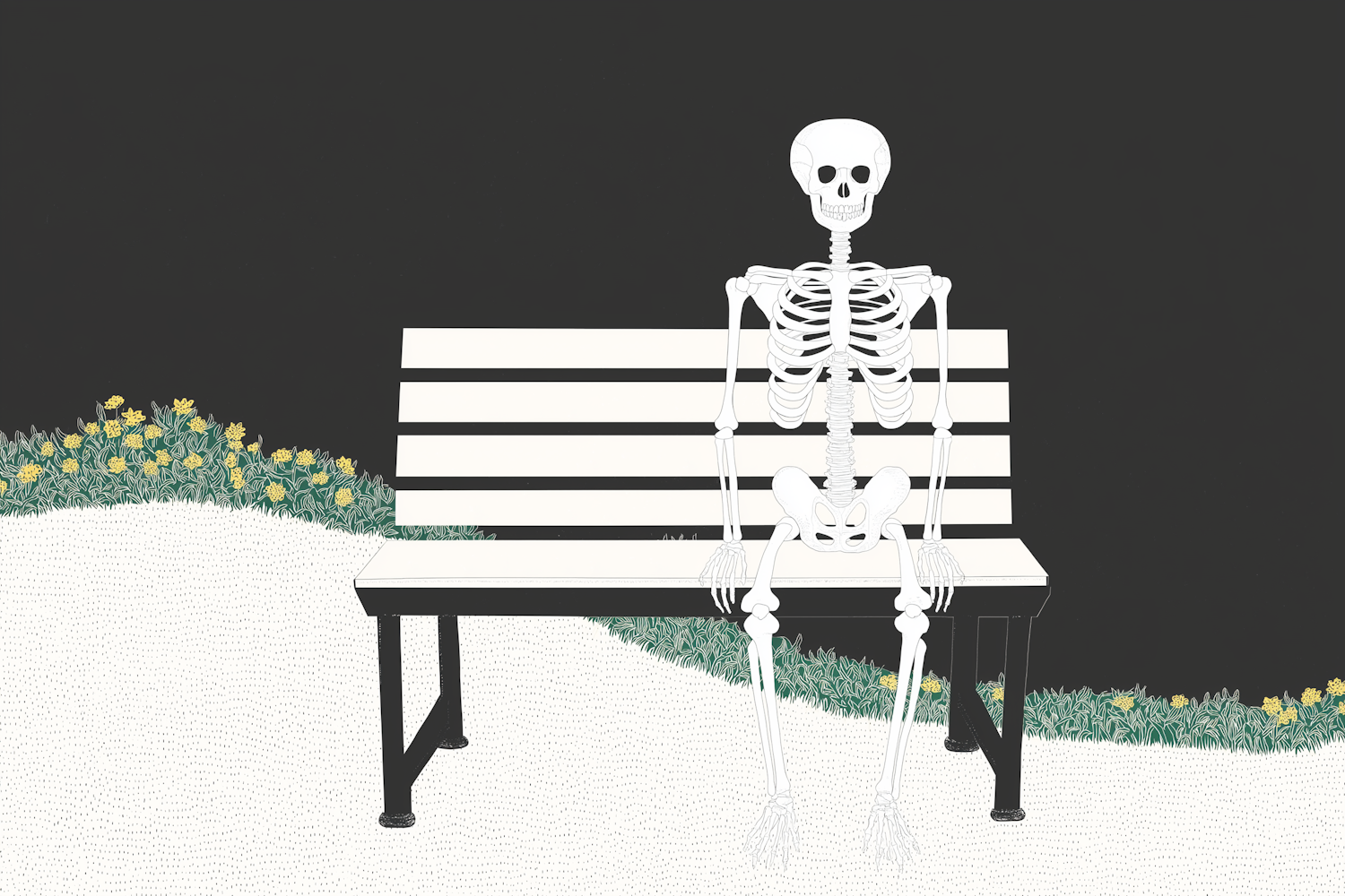 A skeleton on a bench amid a serene park with flowers and dark background, showcasing a mix of natural and surreal elements.