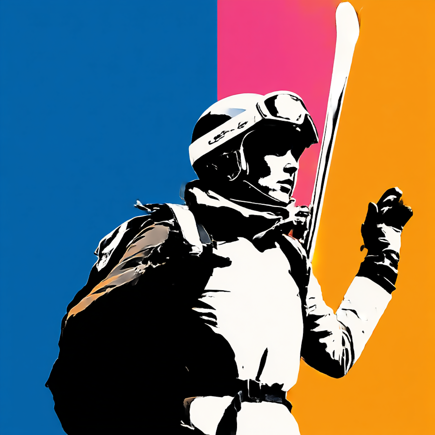 Stylized skier illustration with helmet and goggles, vibrant tricolor background of blue, pink, and orange.