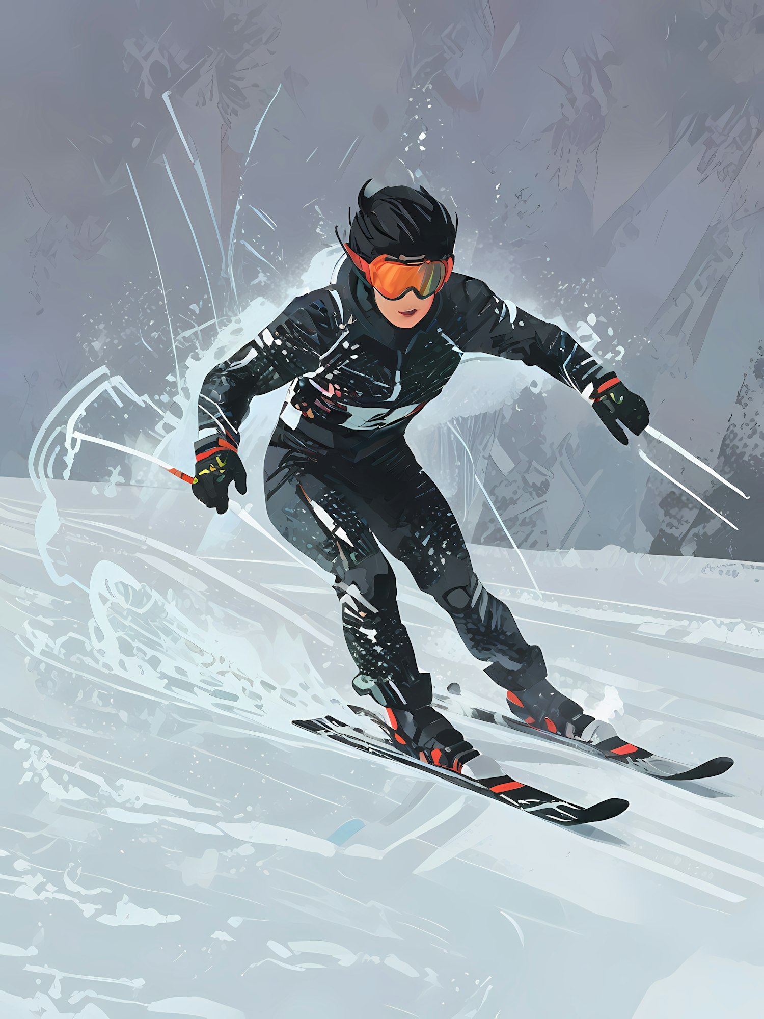 Illustration of a skier in black gear and orange goggles racing down a snowy slope, with snow spraying dynamically around them.