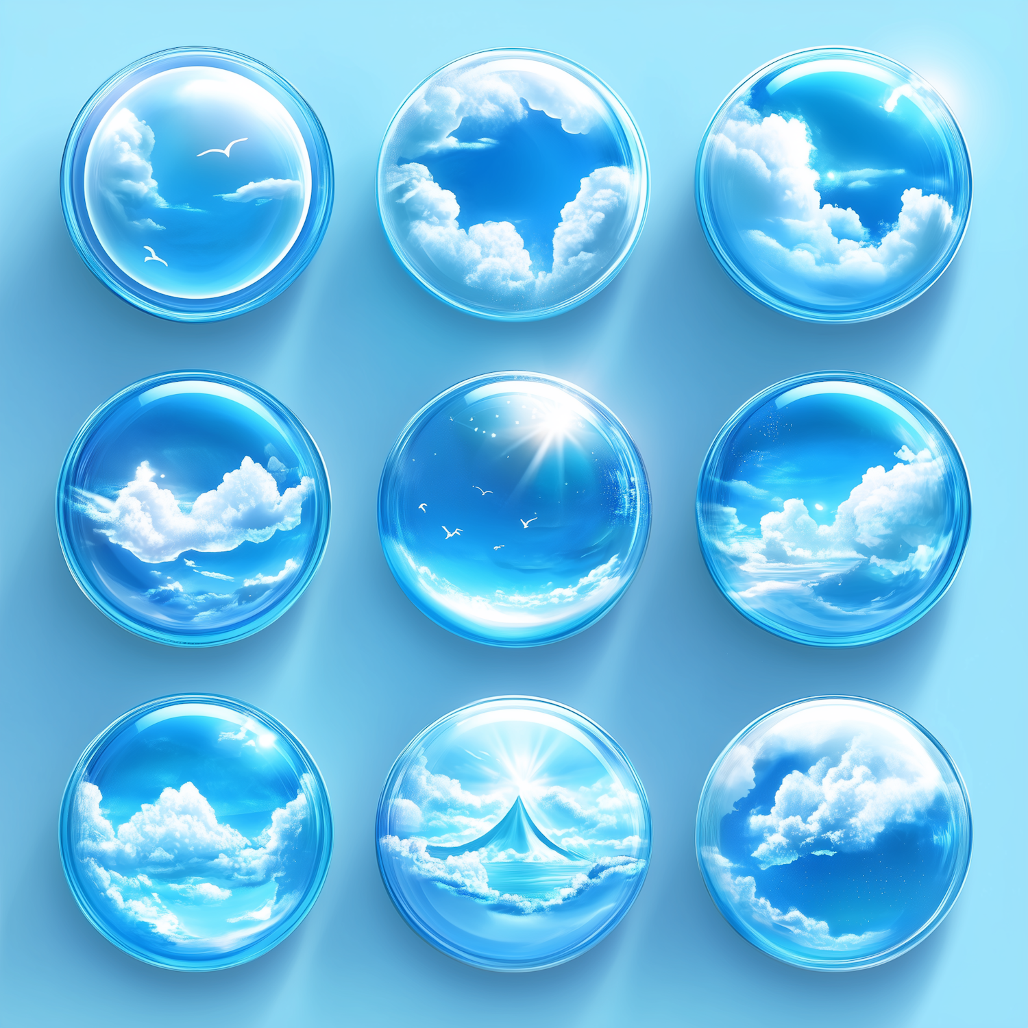 Nine glossy orbs with serene sky scenes, featuring clouds, sunlight, and birds, arranged in a grid on a soft blue background.