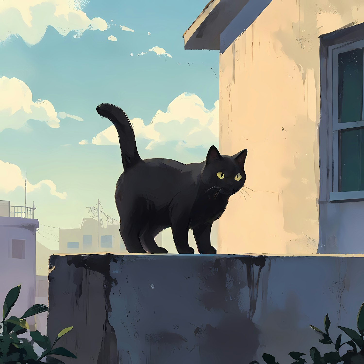 A black cat with yellow eyes stands on a ledge against a blue sky, surrounded by urban buildings and greenery.
