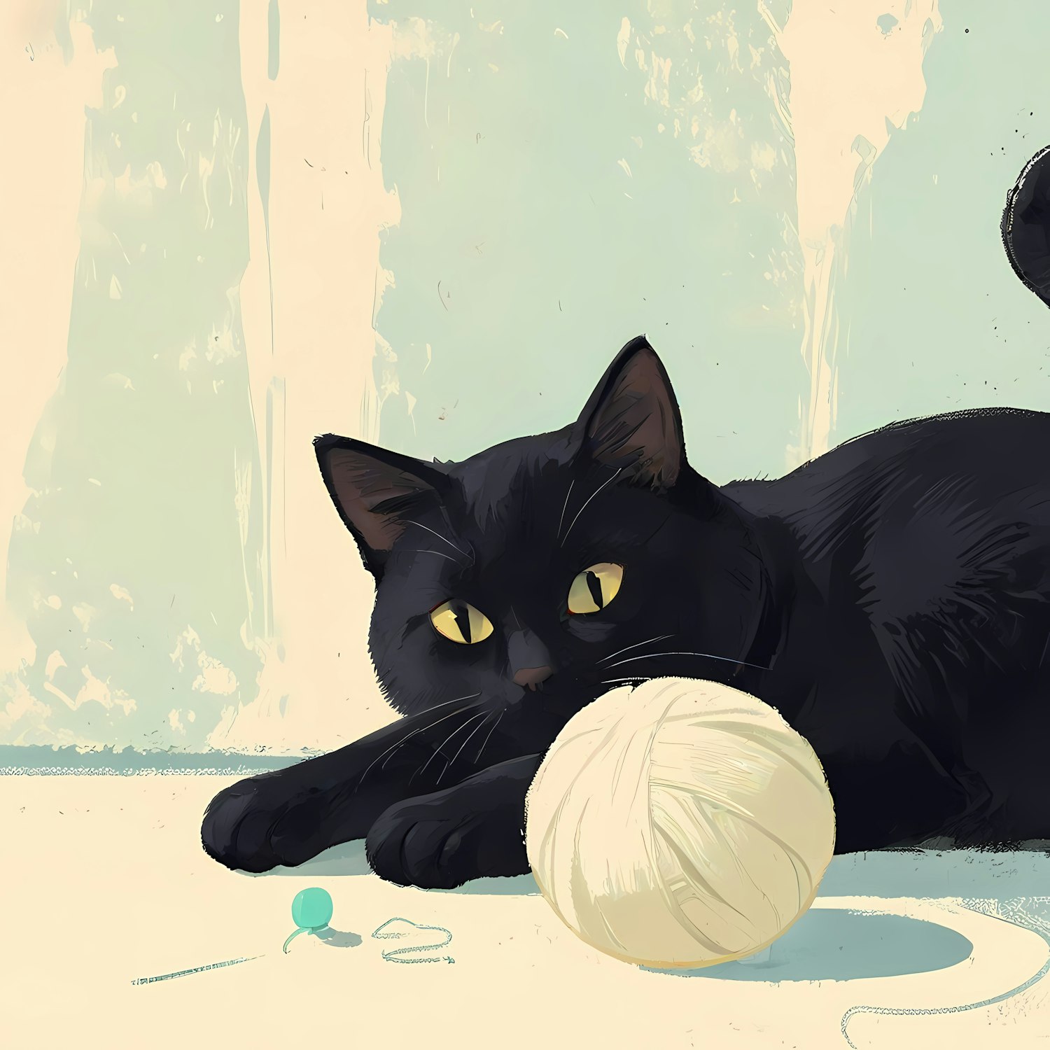 A playful black cat with yellow eyes interacts with a cream yarn ball on a pastel background, creating a whimsical scene.