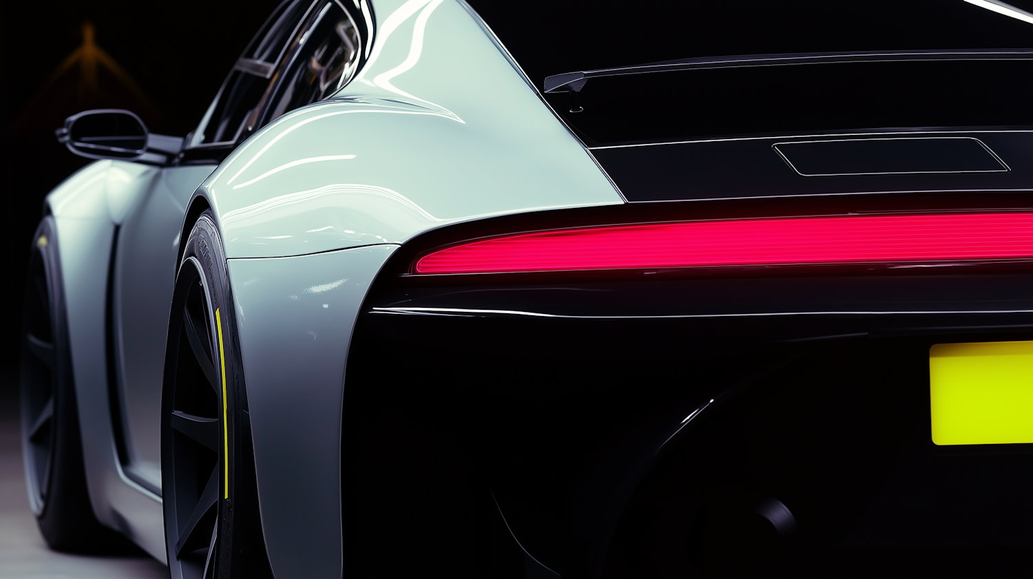 Sleek white sports car with red LED tail light, captured from the rear. Modern design and dark background highlight its elegance.