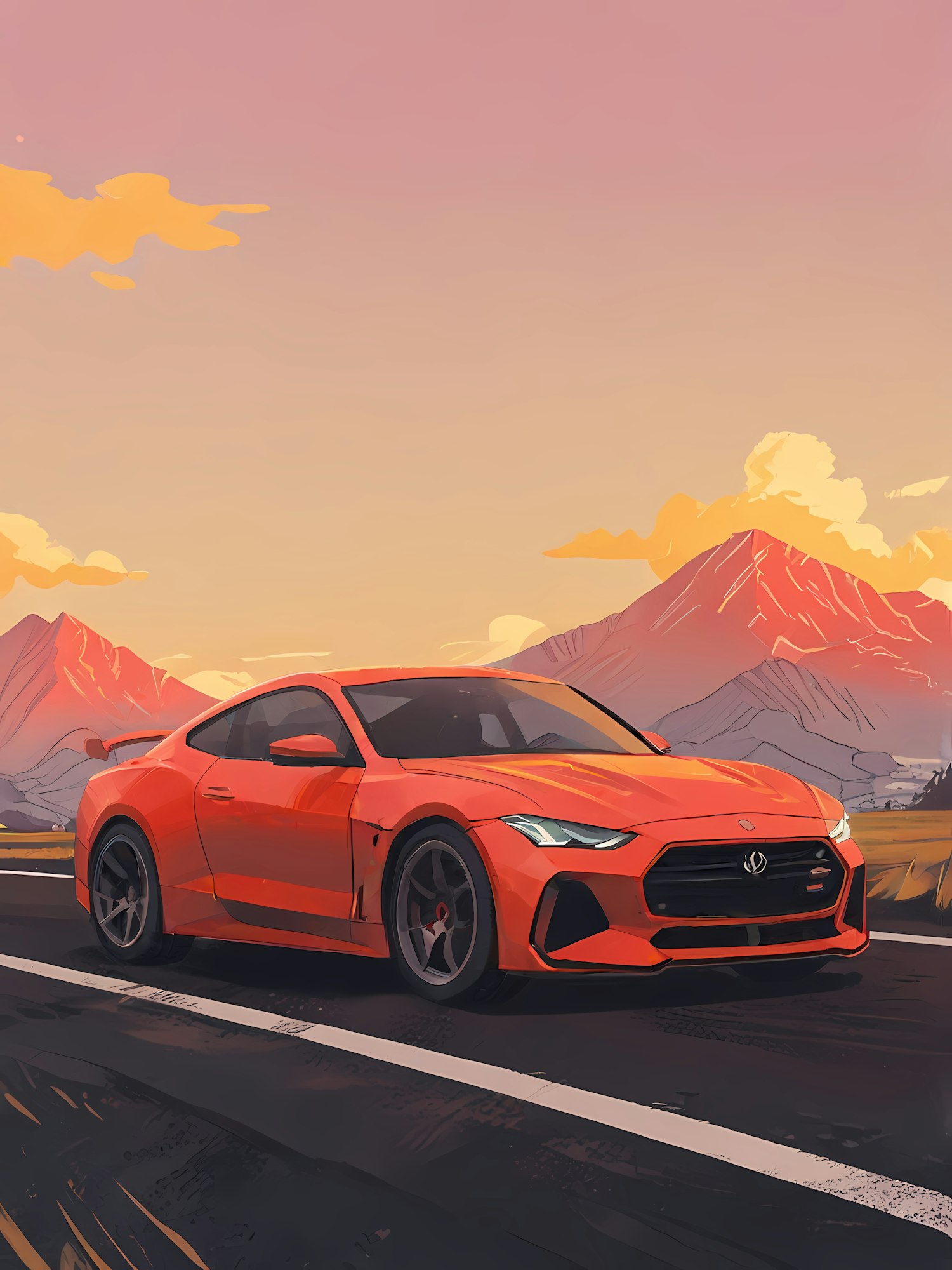 Red sports car on an open road with a stunning mountain and sunset backdrop, highlighting sleek design and vibrant colors.