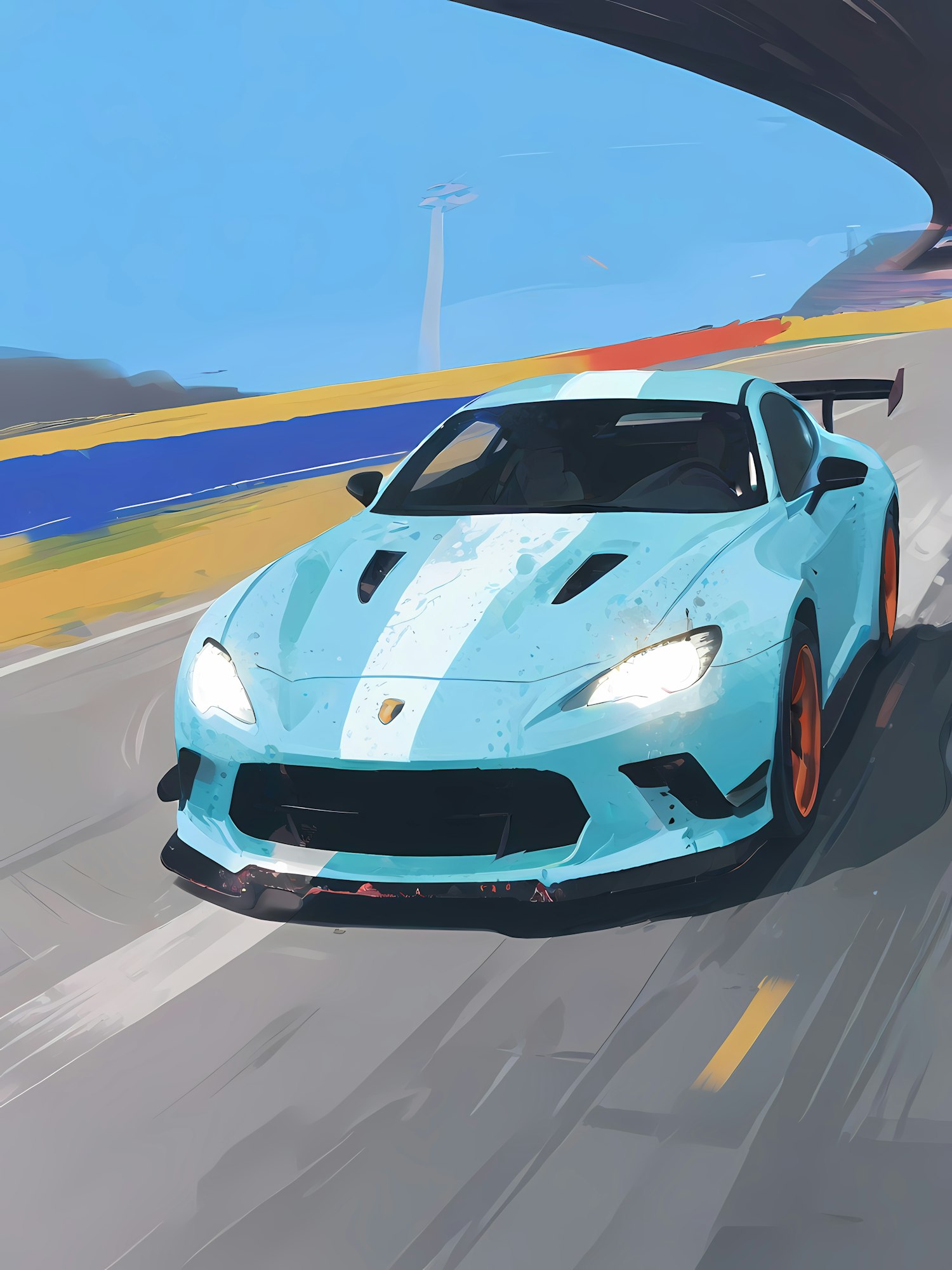 Light blue sports car with white stripe and orange wheels speeding on a racetrack under a bright blue sky. Vibrant and dynamic illustration.