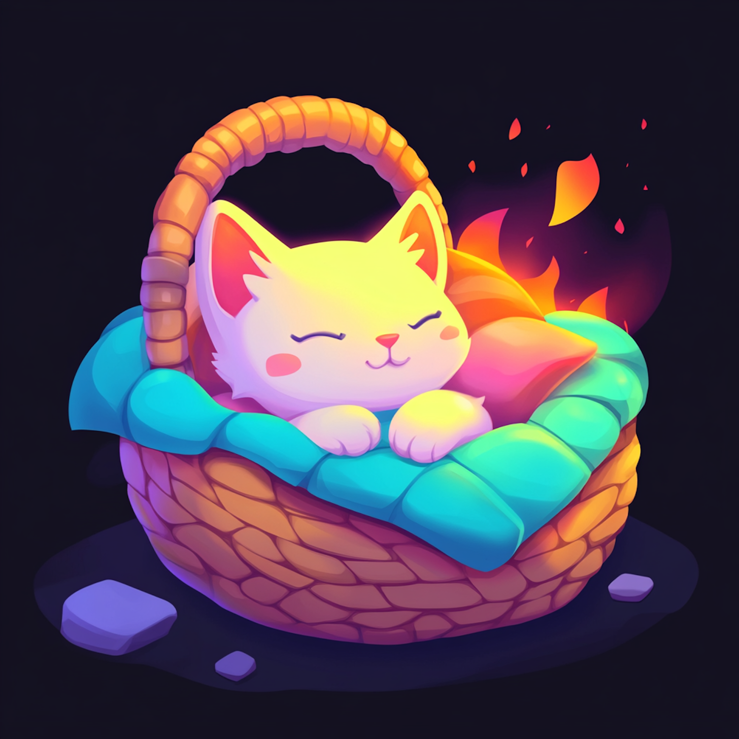 Adorable white cat sleeping in a cozy basket with a turquoise blanket, set against a glowing fire and dark background.