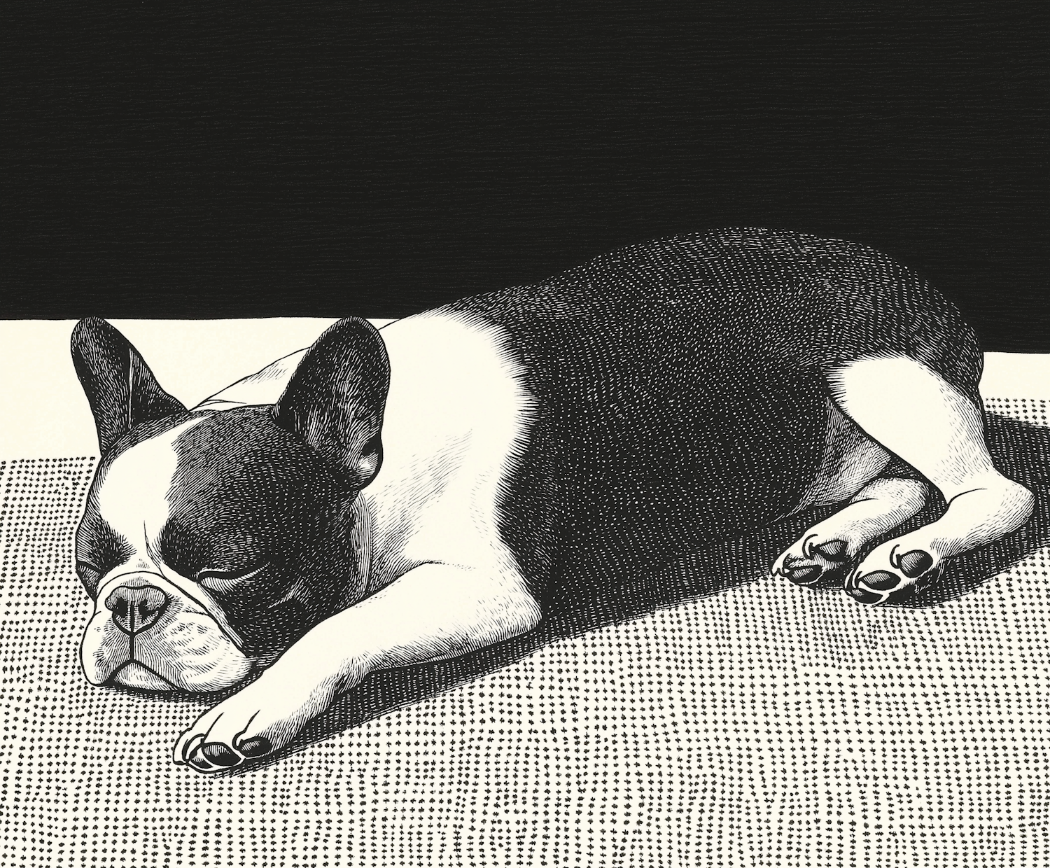 Black and white illustration of a sleeping French Bulldog, detailed with fine lines and a serene composition.