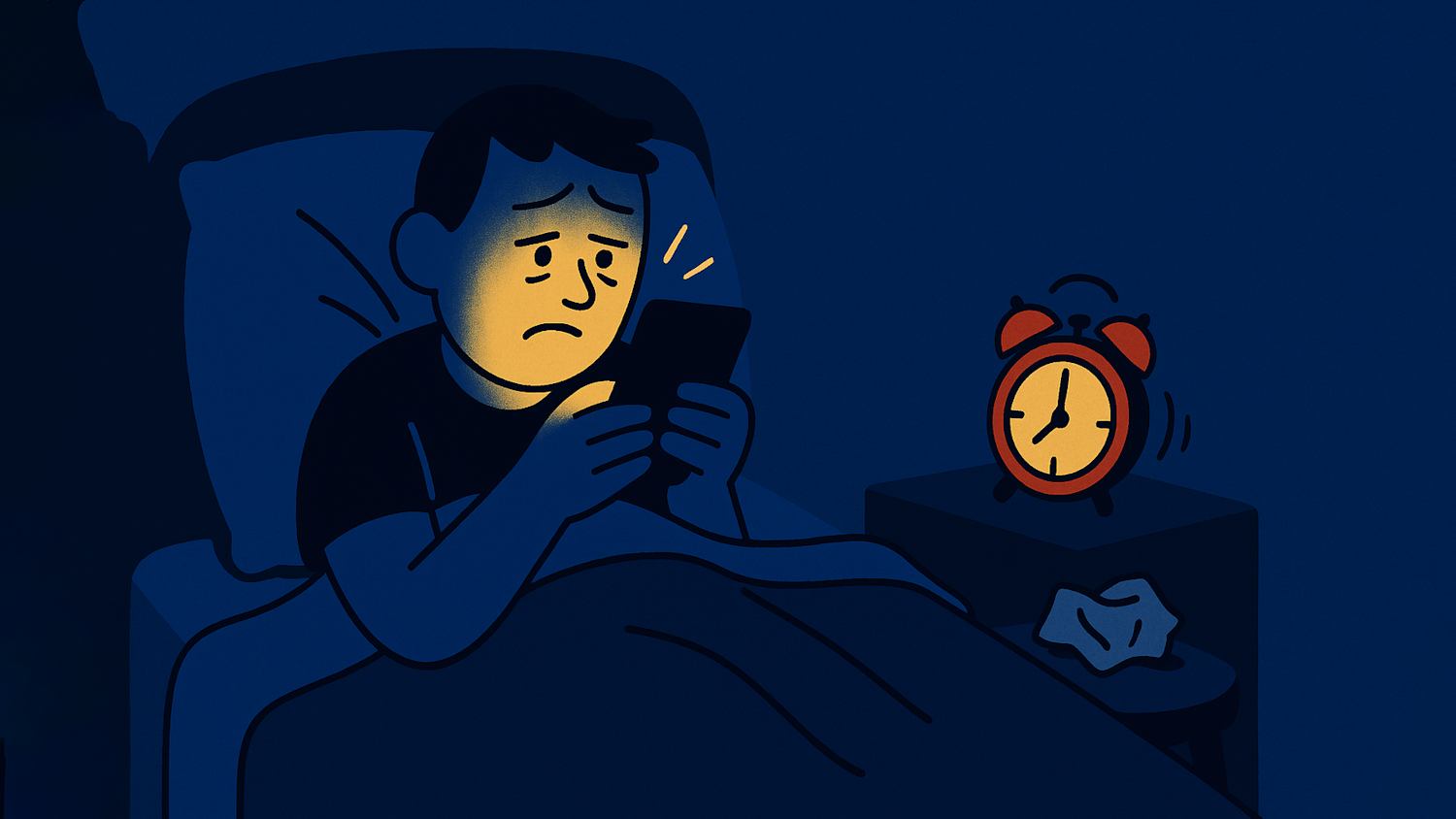 Illustration of a man in bed at night, stressed while using his phone, with a ringing alarm clock on the bedside table.