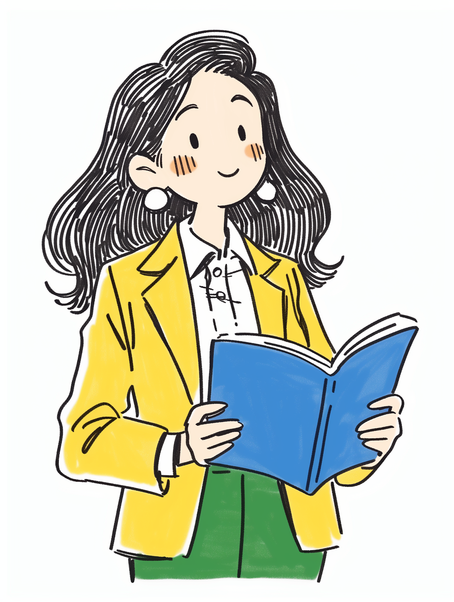 Charming cartoon of an Asian woman reading a book, wearing a yellow blazer and green pants. Perfect for educational or literary themes.
