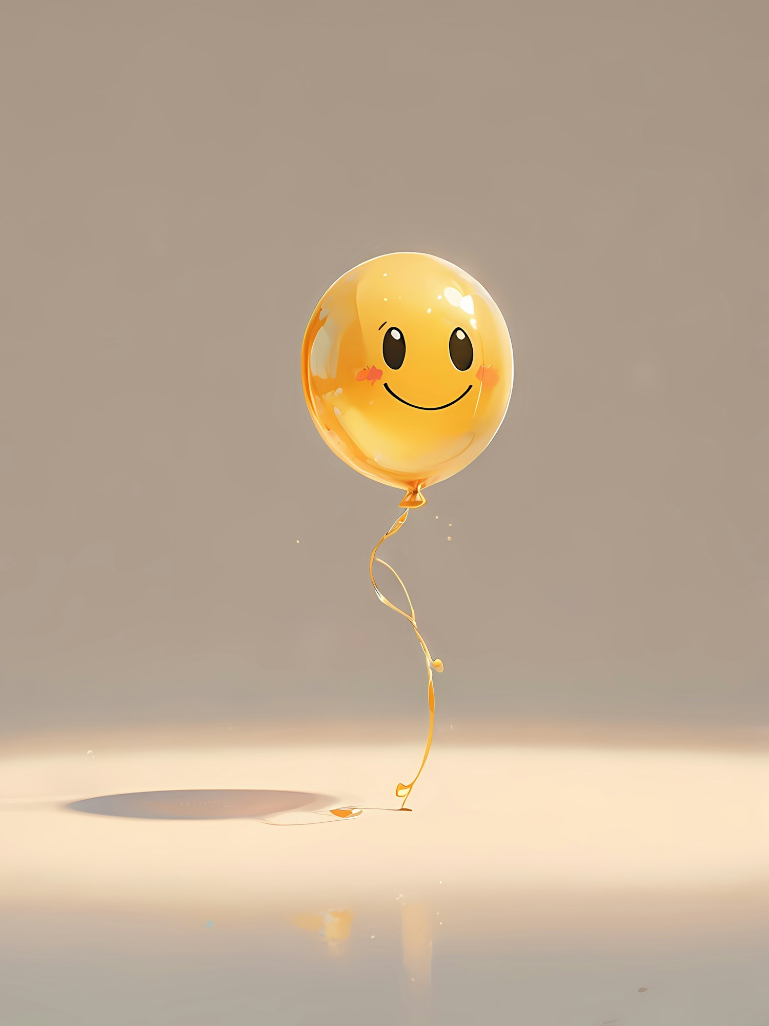 A shiny yellow smiley face balloon with a cute ribbon floats against a beige background, radiating cheerful vibes.