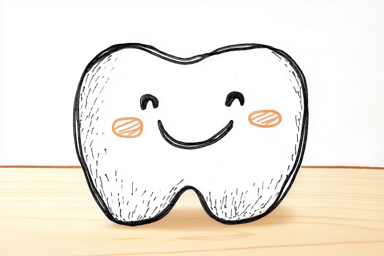 Cute cartoon tooth with a smiling face and orange blush on a wooden surface. Perfect for dental-themed designs.