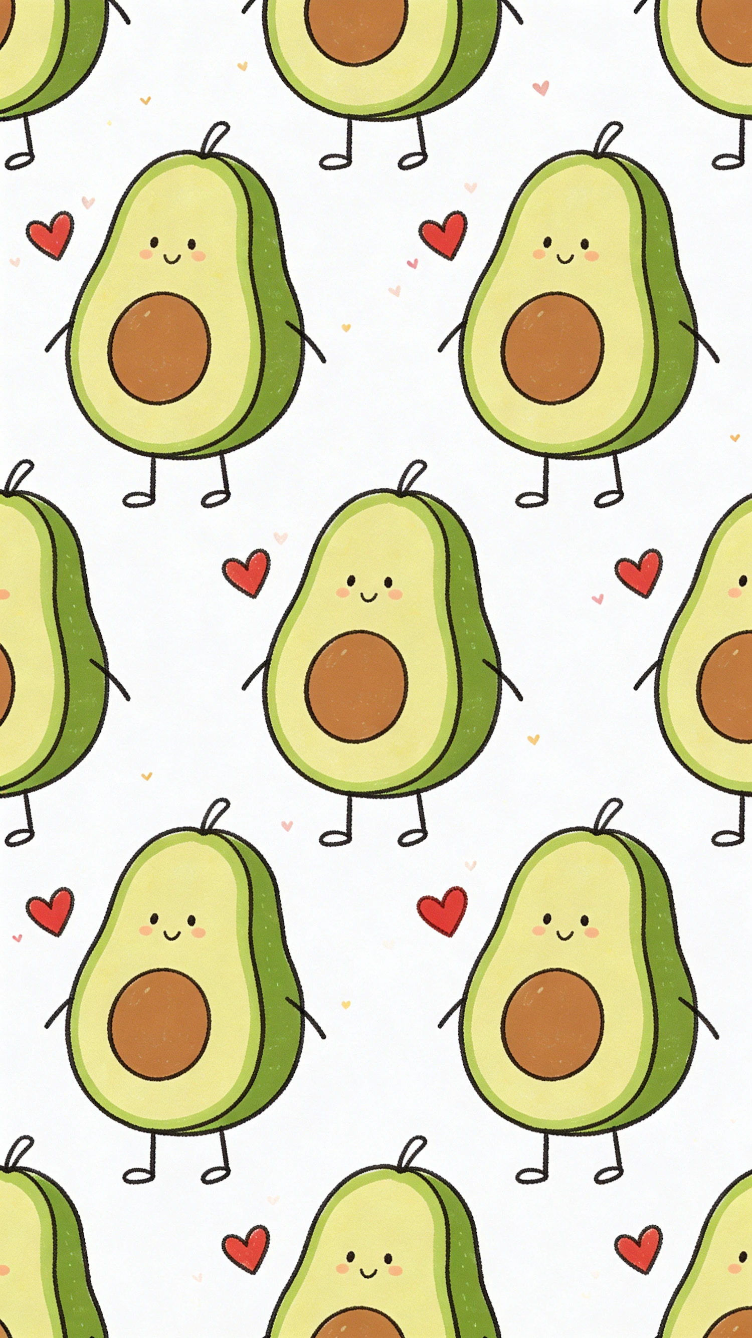 A cute seamless pattern of smiling cartoon avocados with hearts on a white background, perfect for playful and cheerful designs.