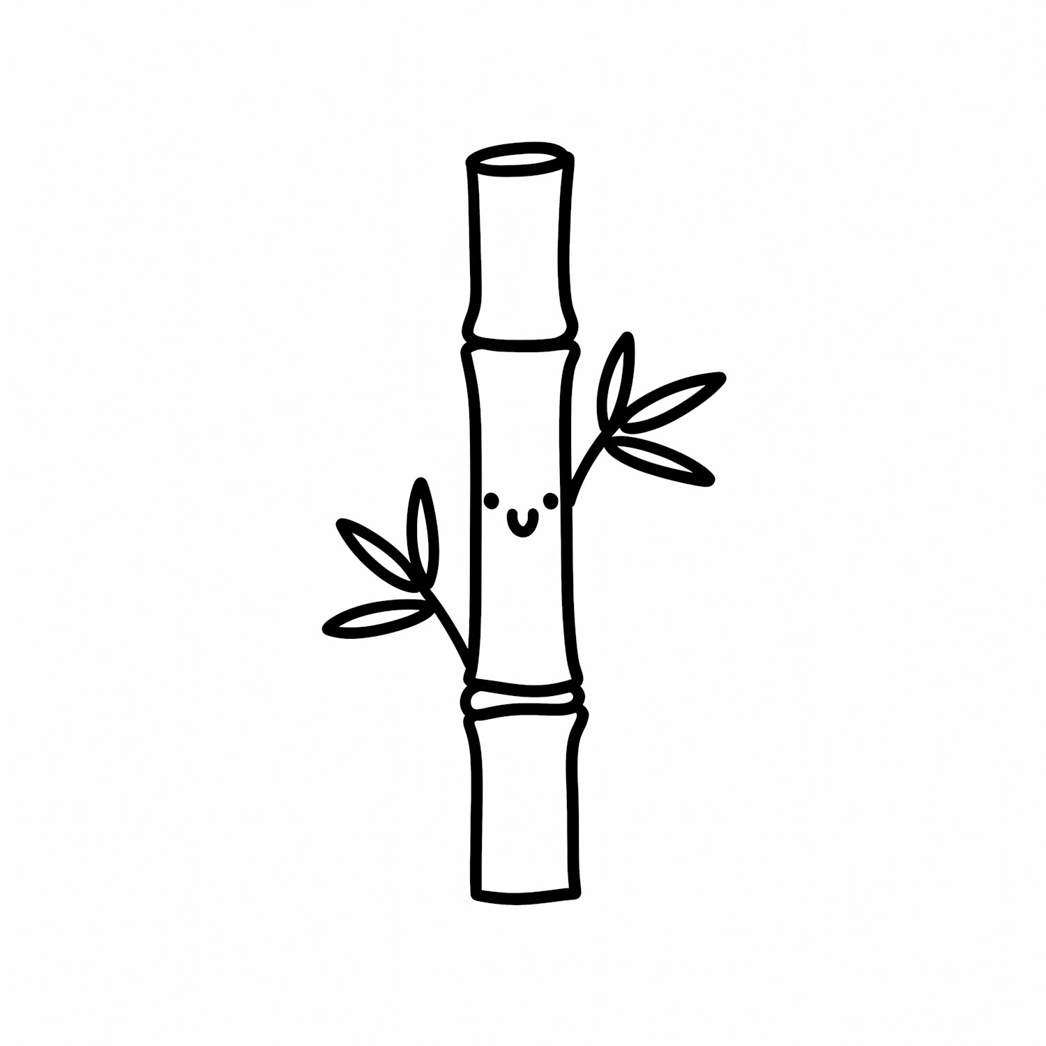 Cute black-and-white cartoon bamboo stalk with a smiling face and small leafy branches, perfect for a playful and minimalistic design.