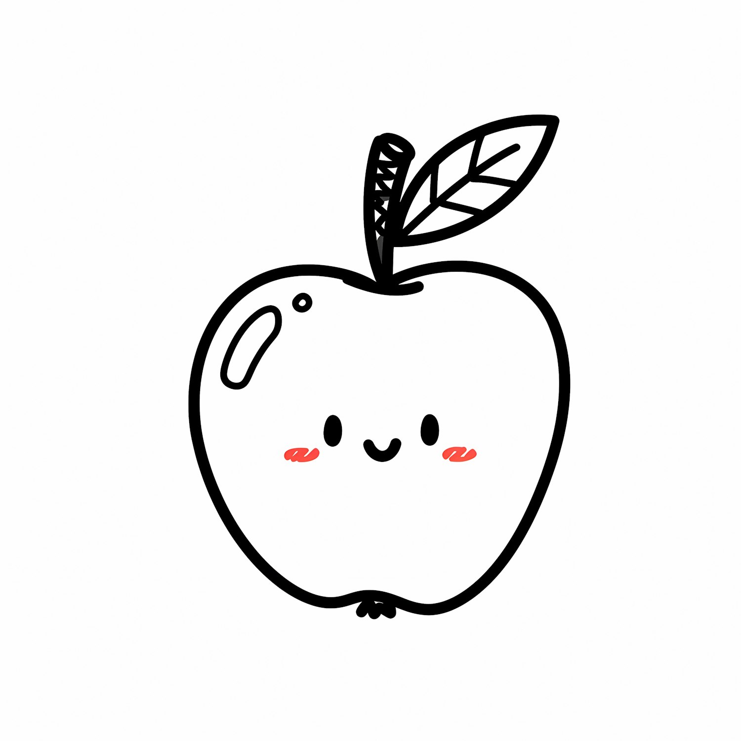 Cute cartoon apple illustration with a smiling face, red cheeks, and a single leaf on a white background. Perfect for kids' designs.