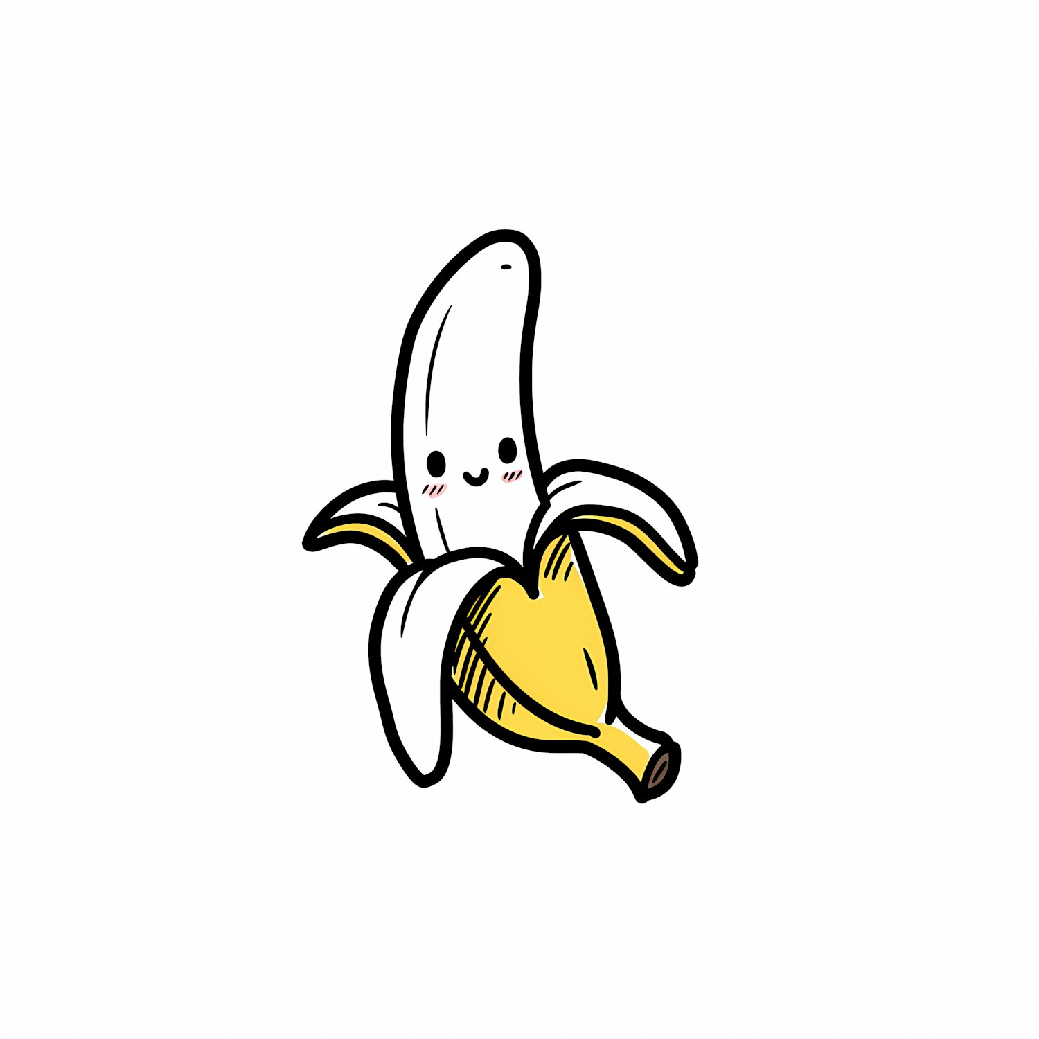 A cute cartoon banana with a smiling face and rosy cheeks, partially peeled to reveal its white interior, on a white background.