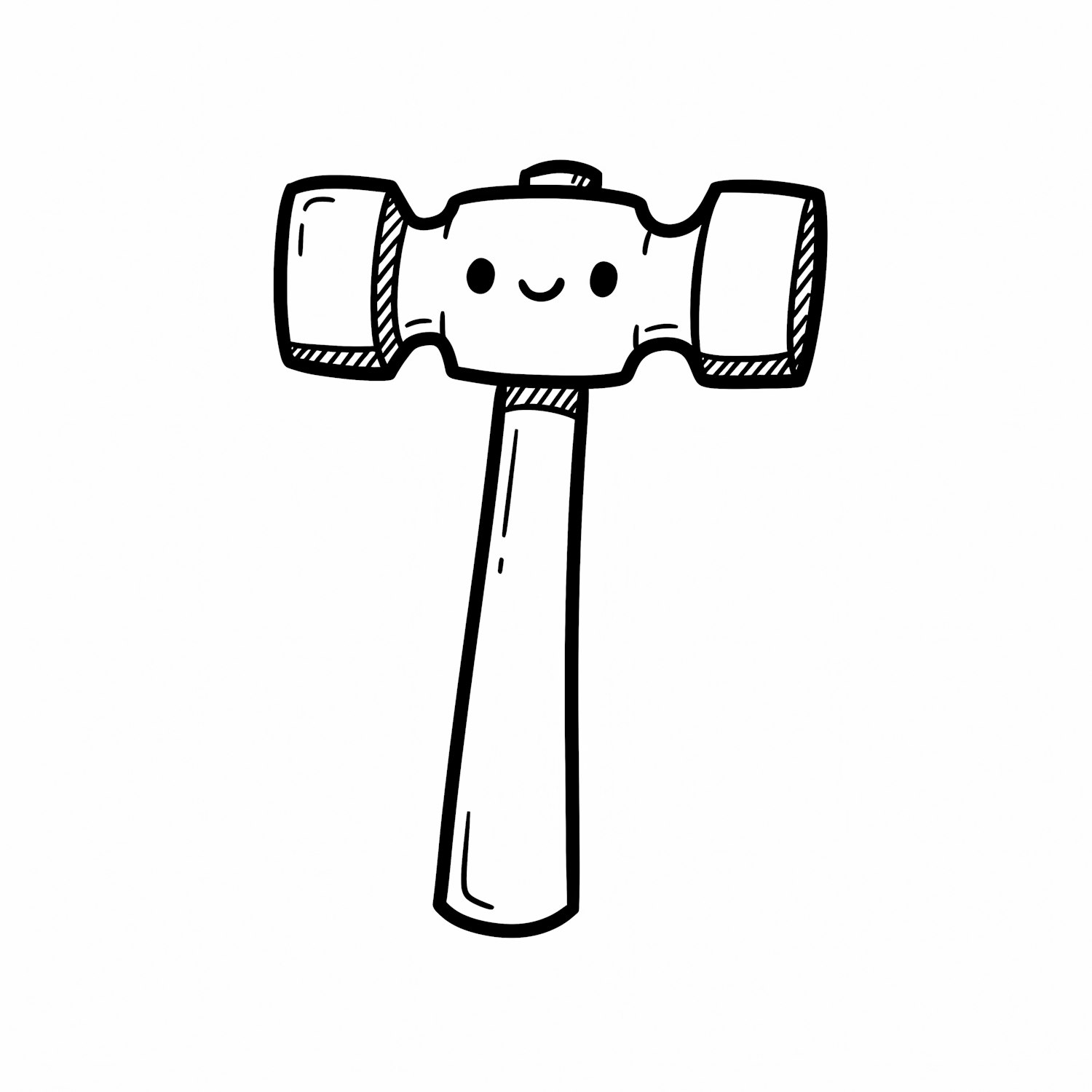 A cute black-and-white cartoon hammer with a smiling face, drawn in a simple and playful style with bold outlines.