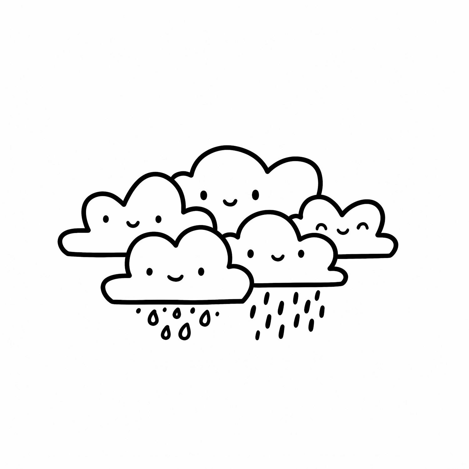 Cute black-and-white illustration of smiling clouds, some raining, perfect for cheerful and playful designs.