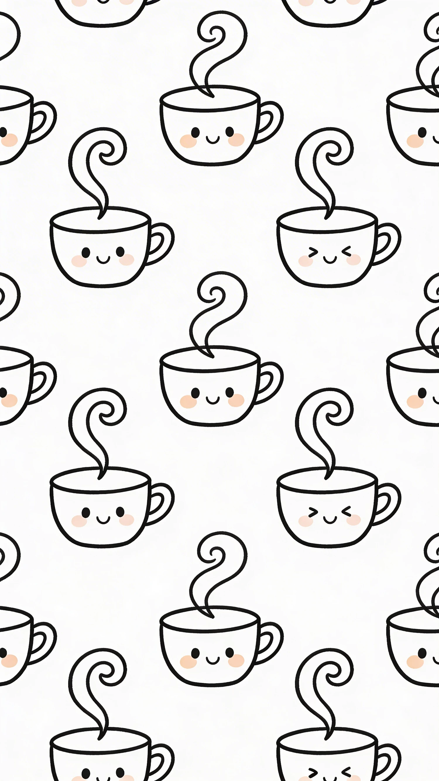 Adorable cartoon coffee cups with smiling faces and swirling steam on a white background, perfect for a cheerful and cozy design.