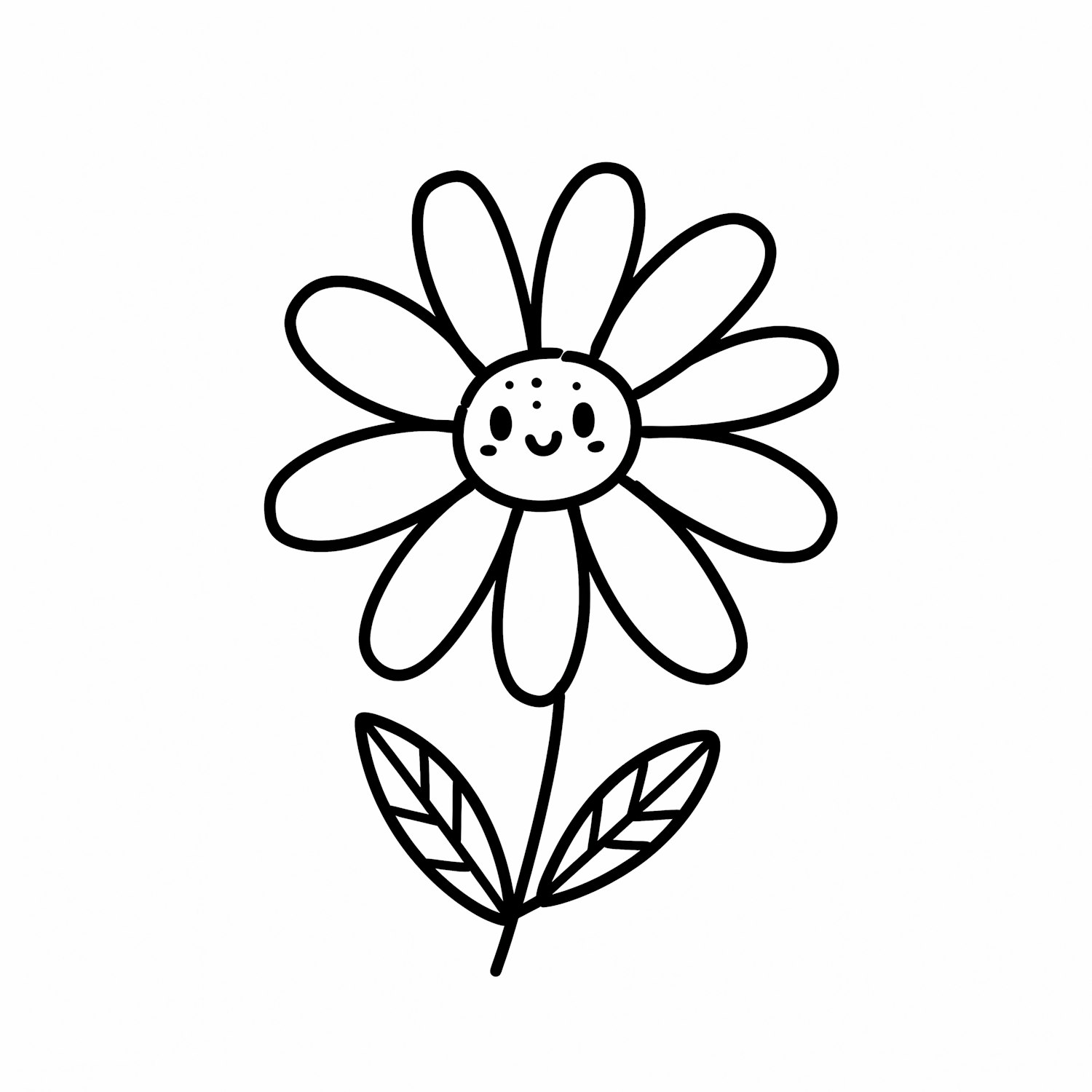 A cute black-and-white line drawing of a smiling flower with a cheerful face, surrounded by petals and two leaves on a plain background.