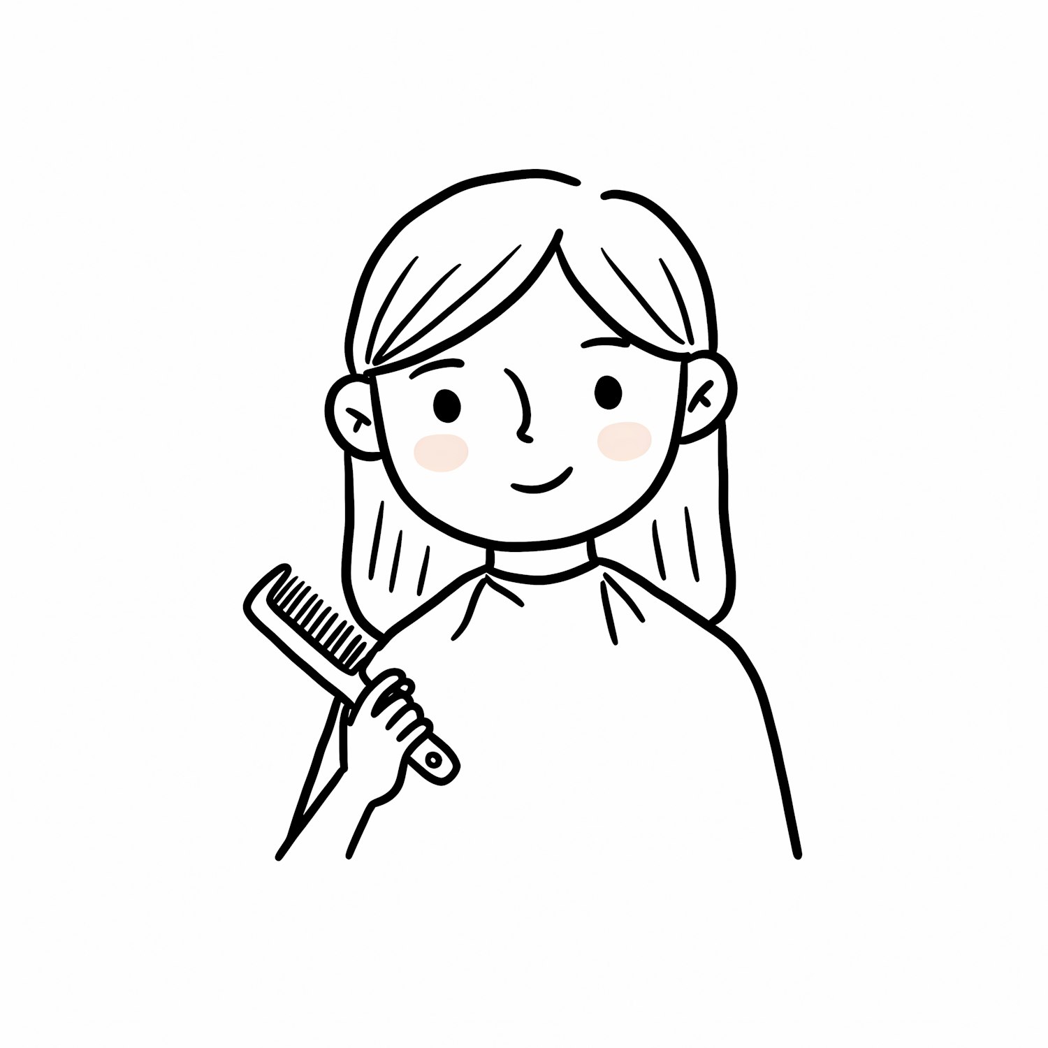 A cheerful line drawing of a girl holding a comb, with a simple and clean design, perfect for illustrating grooming or self-care themes.