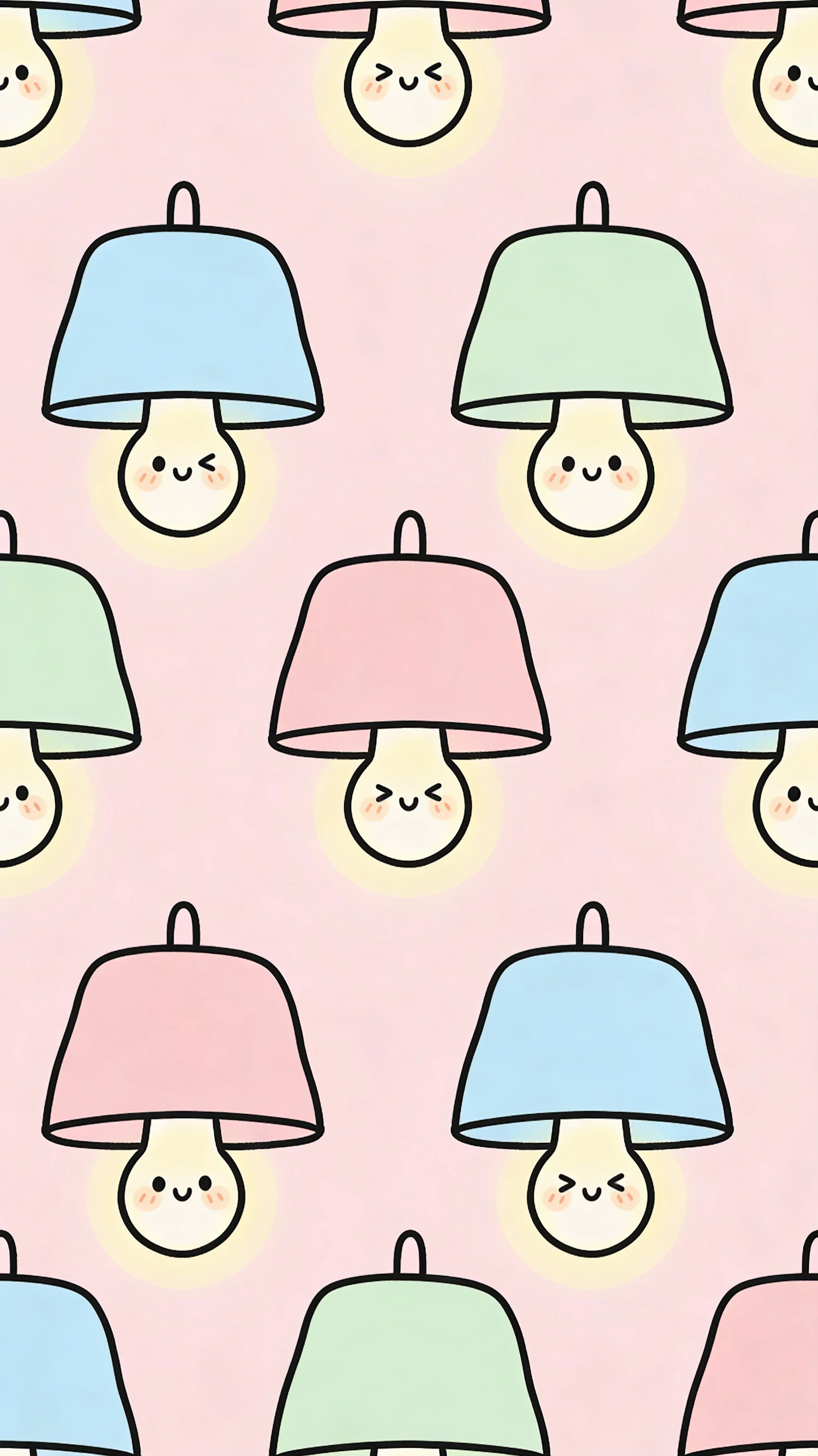 Repeating pattern Lamps with blinking eyes, glowing bulbs, soft pastel background.