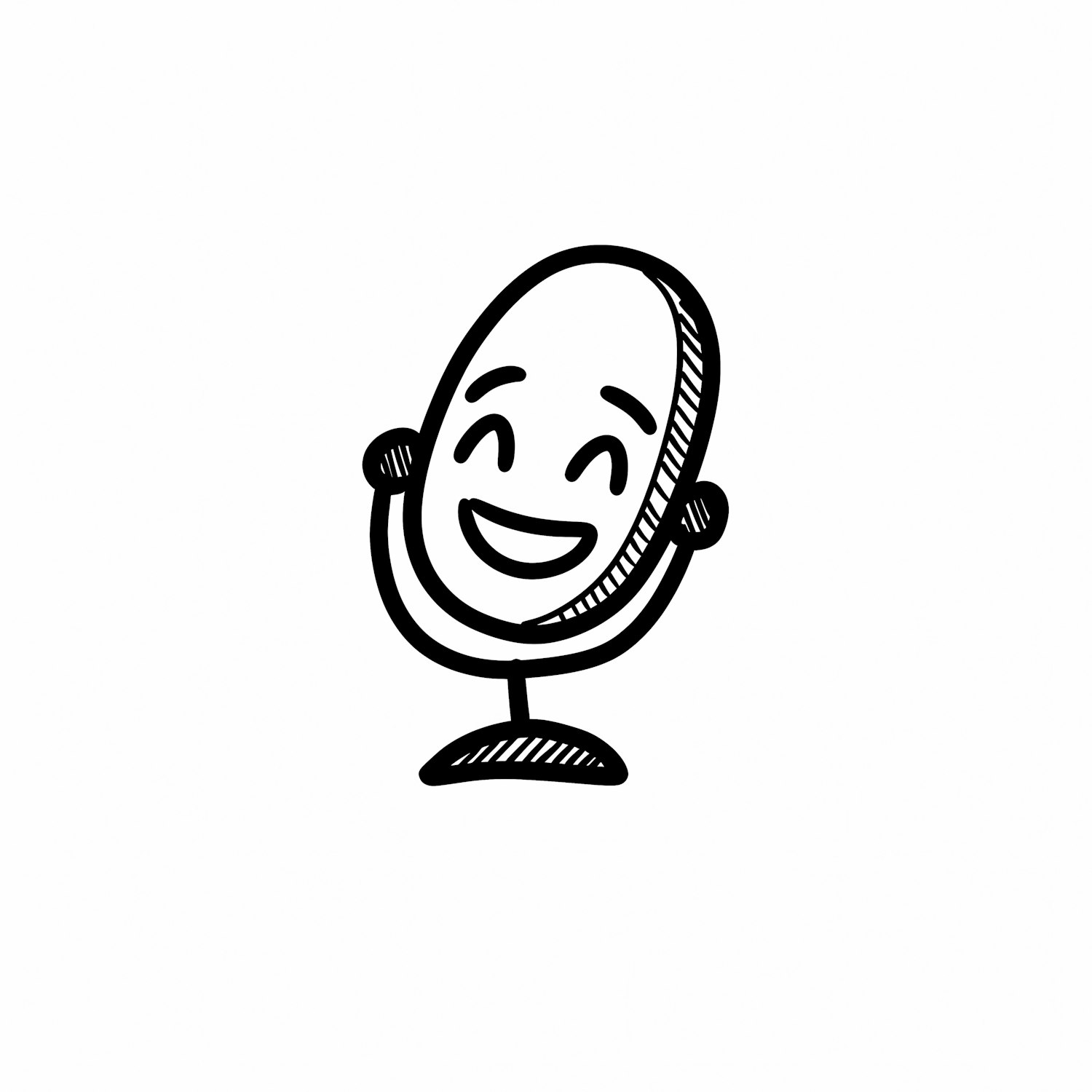 A cheerful black-and-white illustration of a smiling face on a mirror-like object, mounted on a stand, with a minimalistic design.