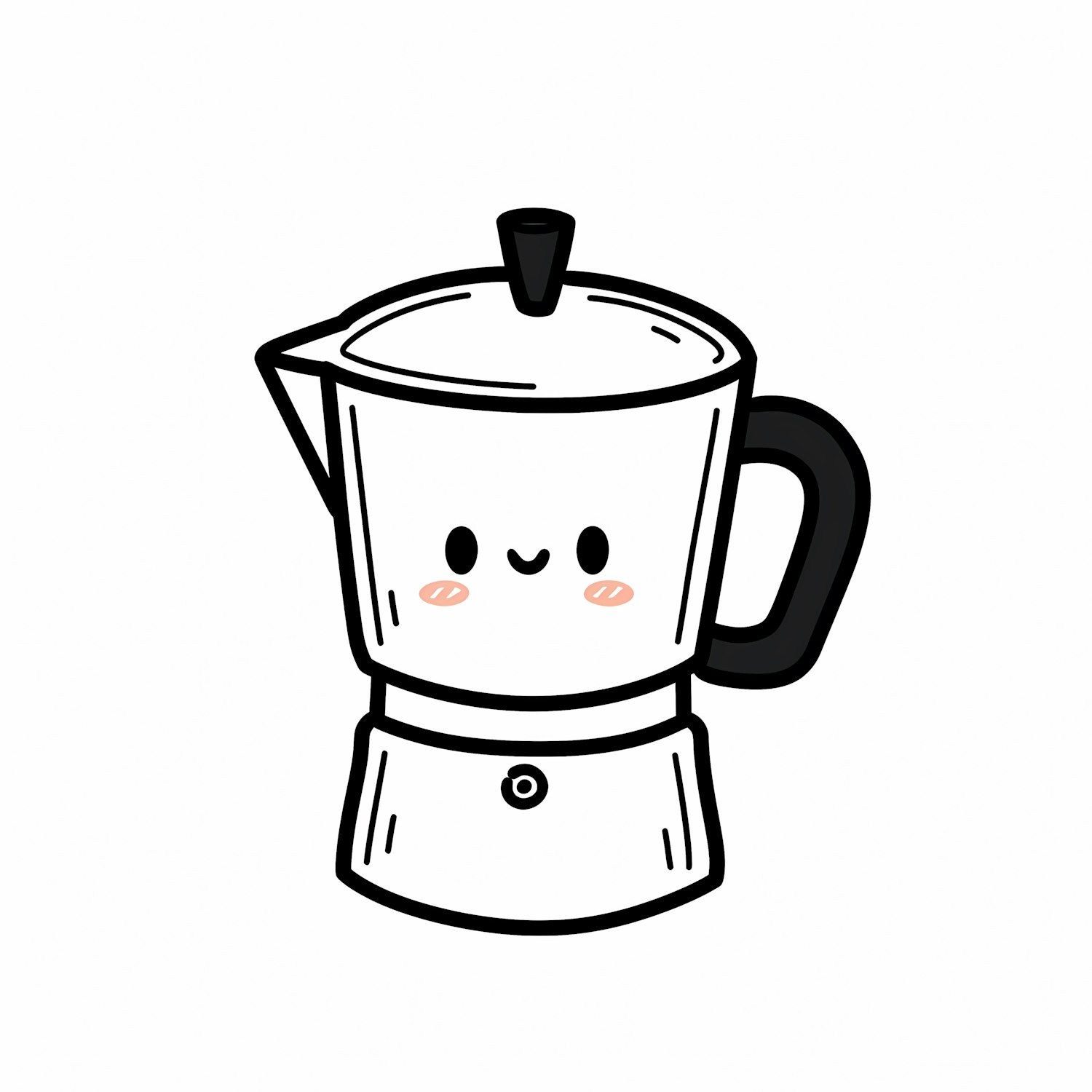 Adorable illustration of a moka pot with a cute smiling face and pink cheeks, perfect for coffee lovers and whimsical designs.