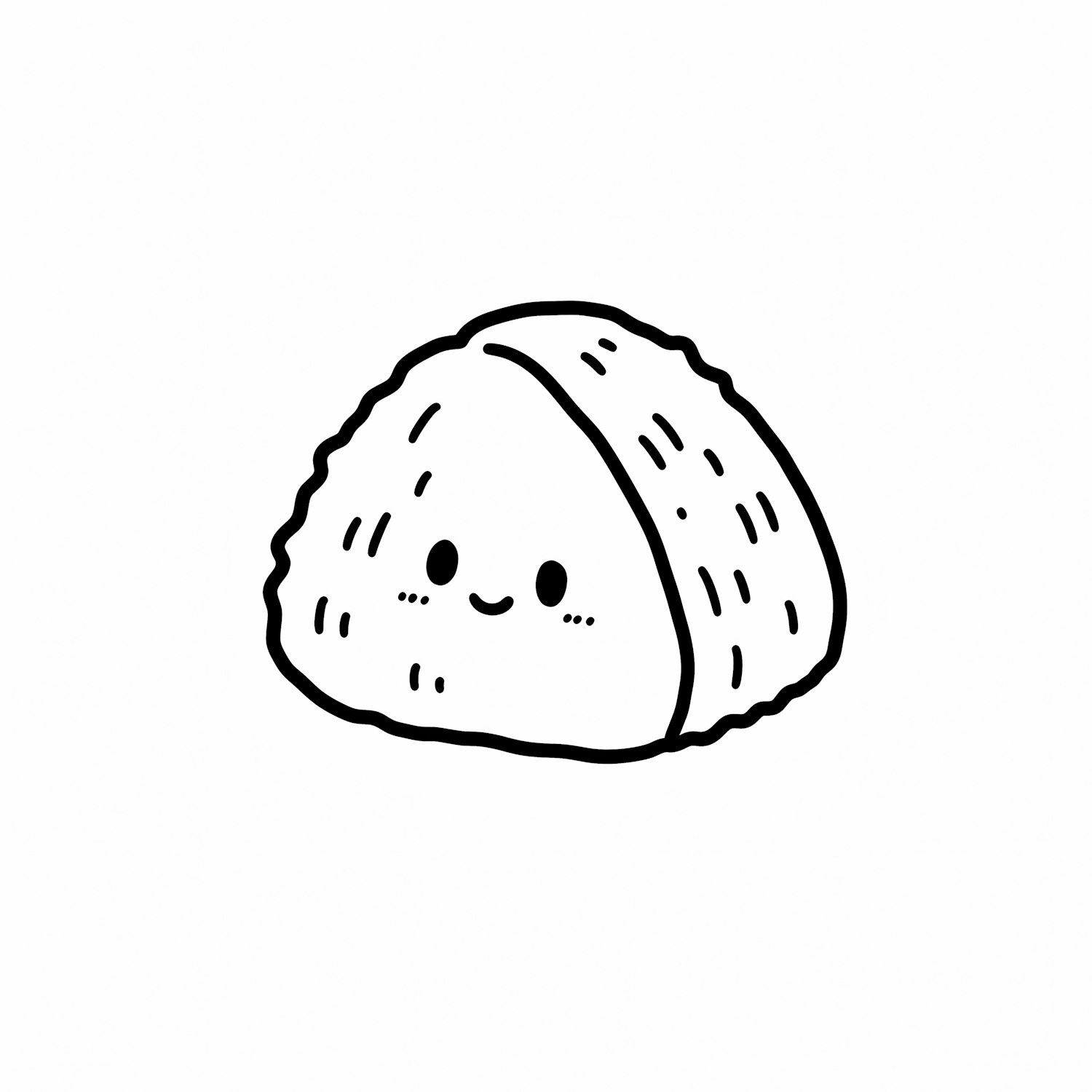 Adorable black-and-white illustration of a smiling onigiri with a cute face, perfect for adding charm to any design or project.