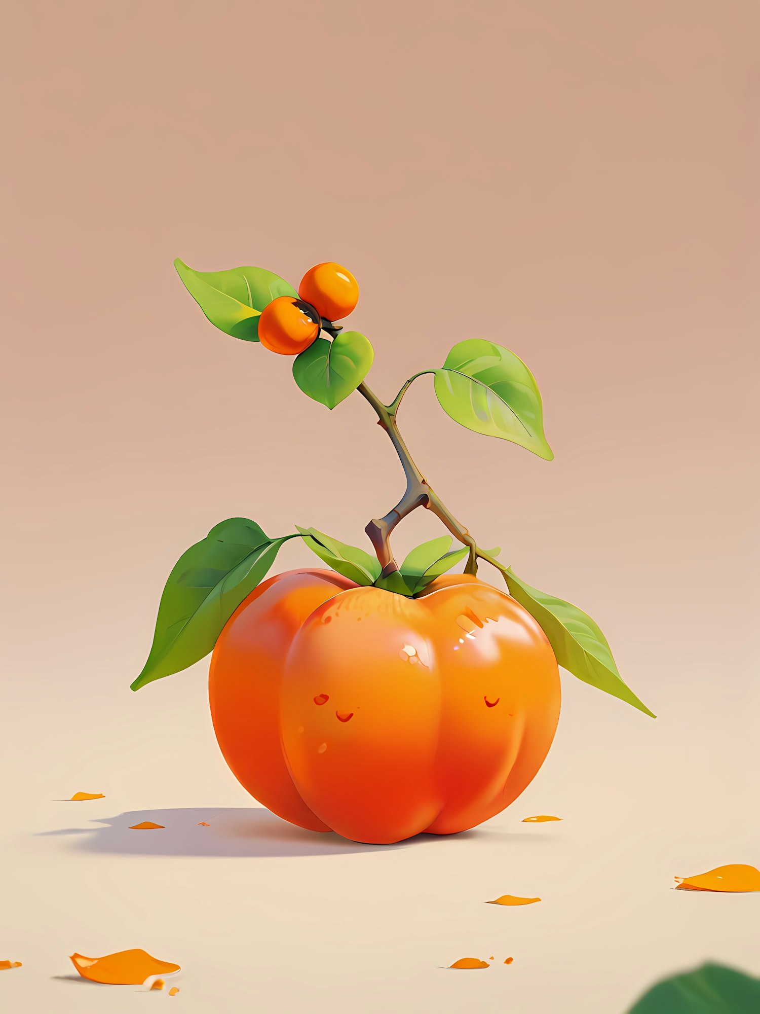 Adorable illustration of a smiling persimmon with green leaves and smaller fruits on a soft beige background. Perfectly playful and vibrant!