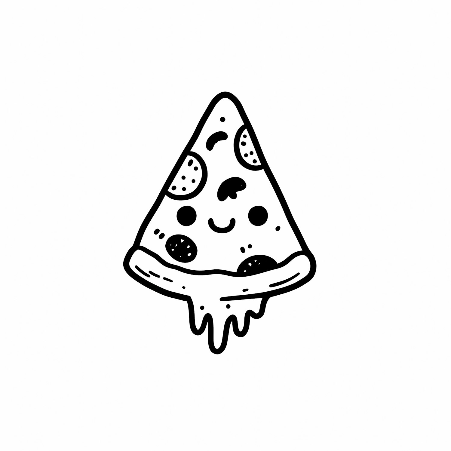 A cute black-and-white cartoon pizza slice with a smiling face and dripping cheese, perfect for fun designs or food-themed projects.