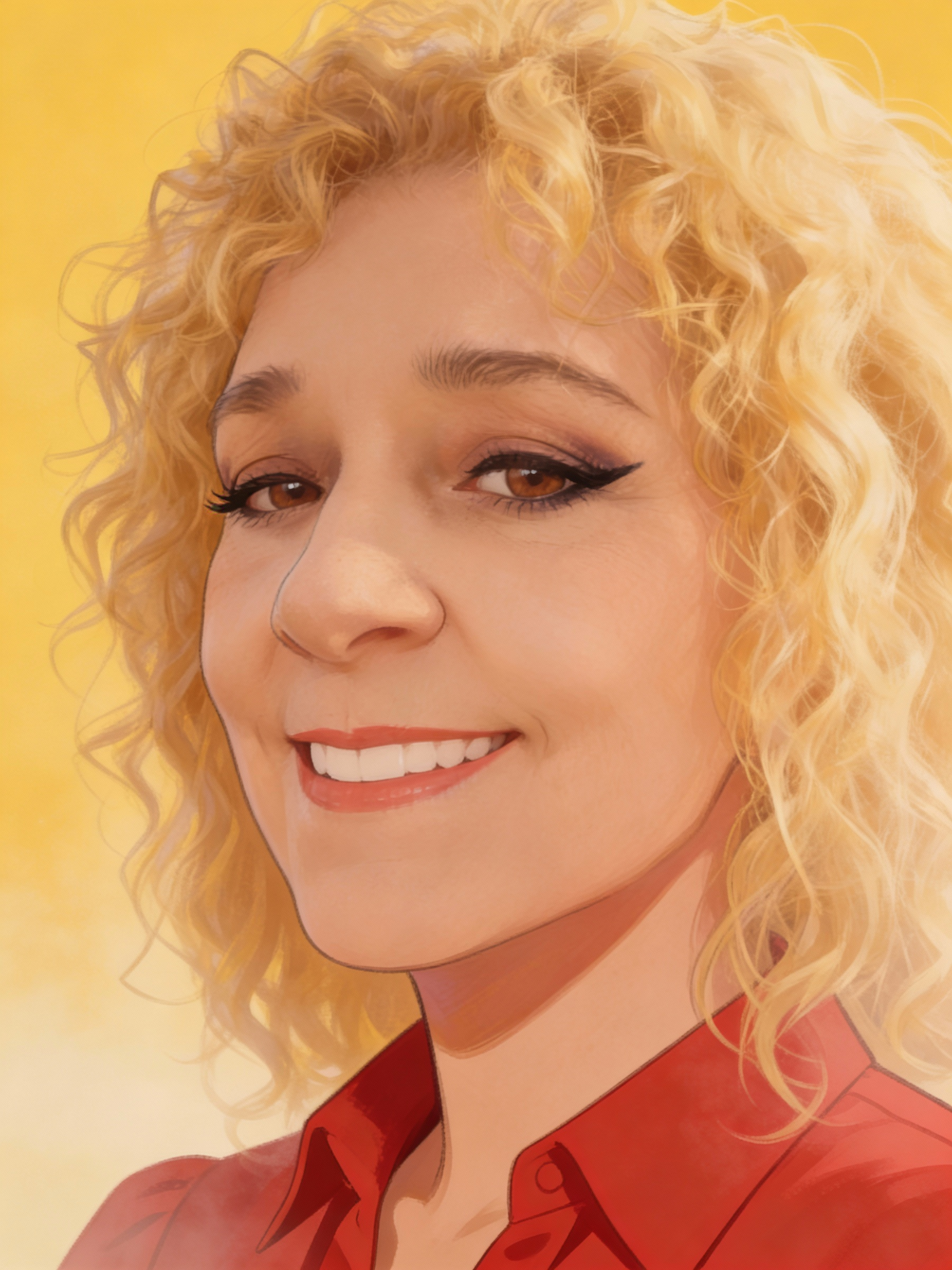 A vibrant digital portrait of a smiling individual with curly blonde hair, wearing a red shirt against a warm yellow background.