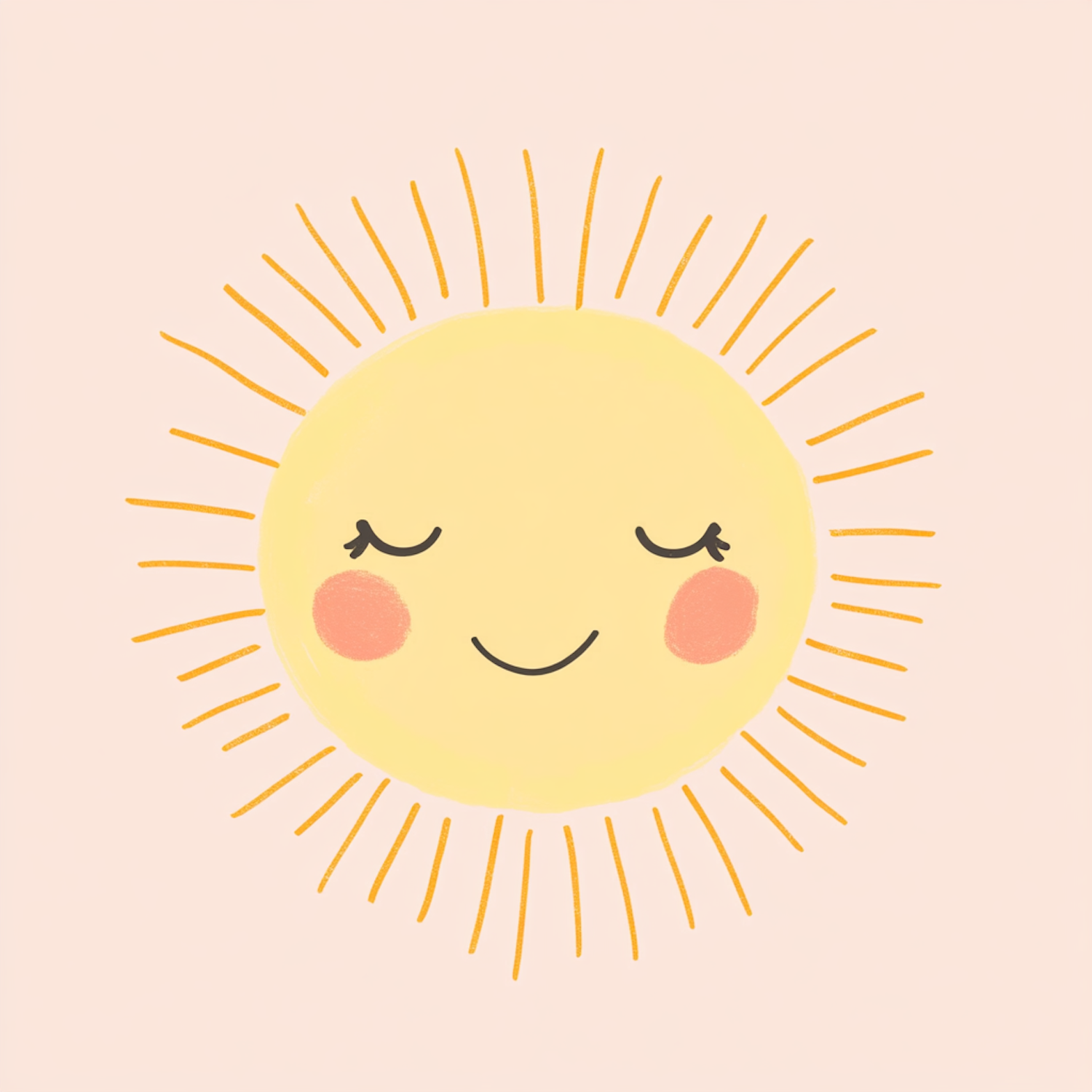 Cute sun illustration with a smiling face, pink cheeks, and orange rays on a pastel peach background.
