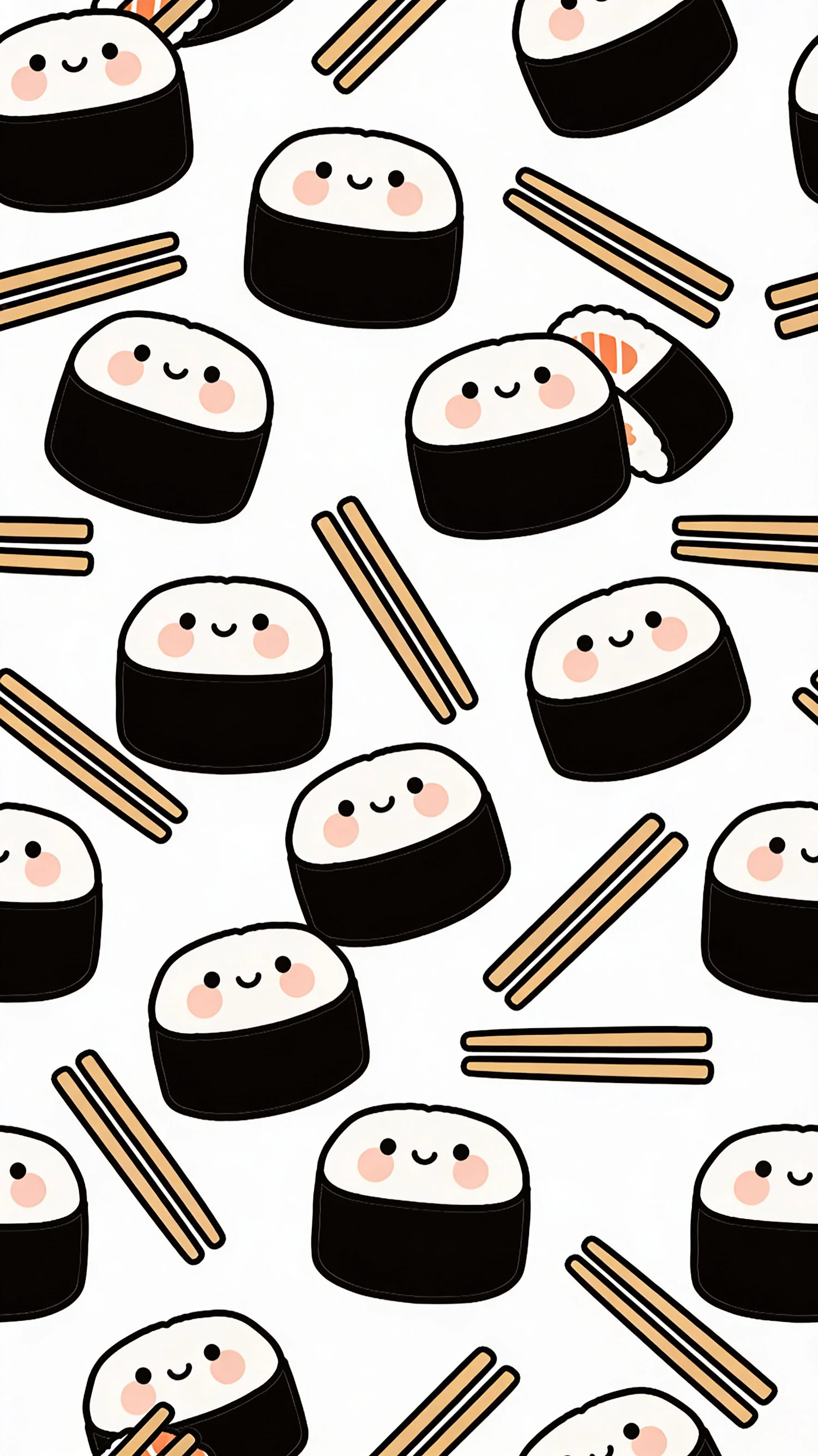 Cute cartoon sushi rolls with smiling faces and chopsticks on a white background, forming a playful and seamless pattern.