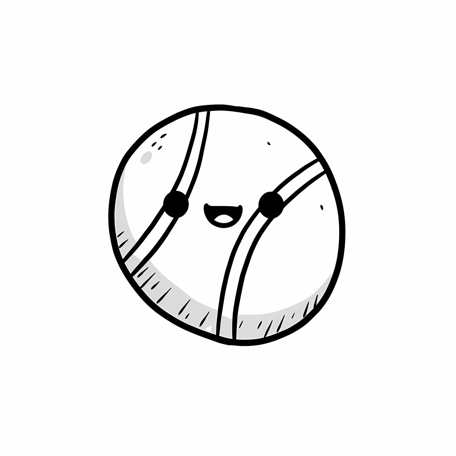 A cute black-and-white cartoon tennis ball with a smiling face, featuring simple lines and a cheerful expression.