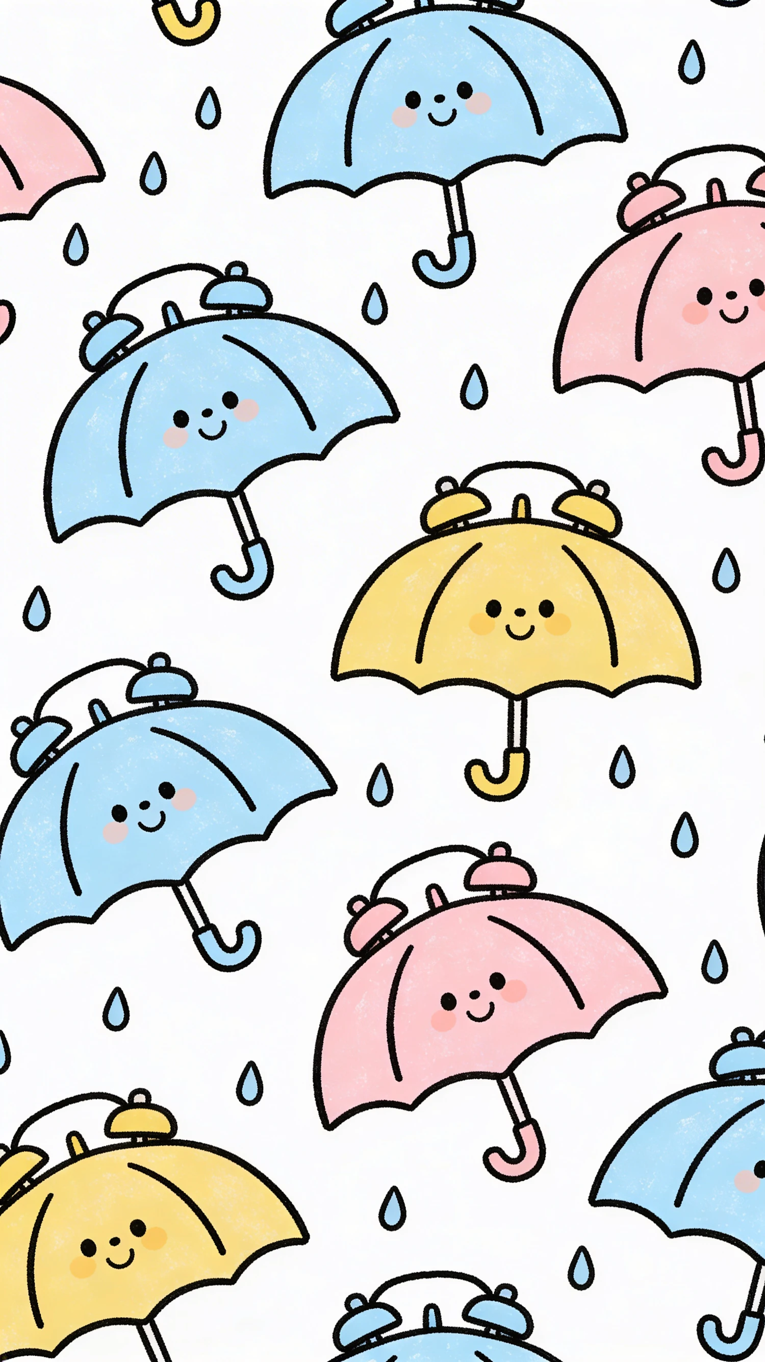 A cute pattern of smiling pastel umbrellas with raindrops on a white background, perfect for cheerful and playful designs.