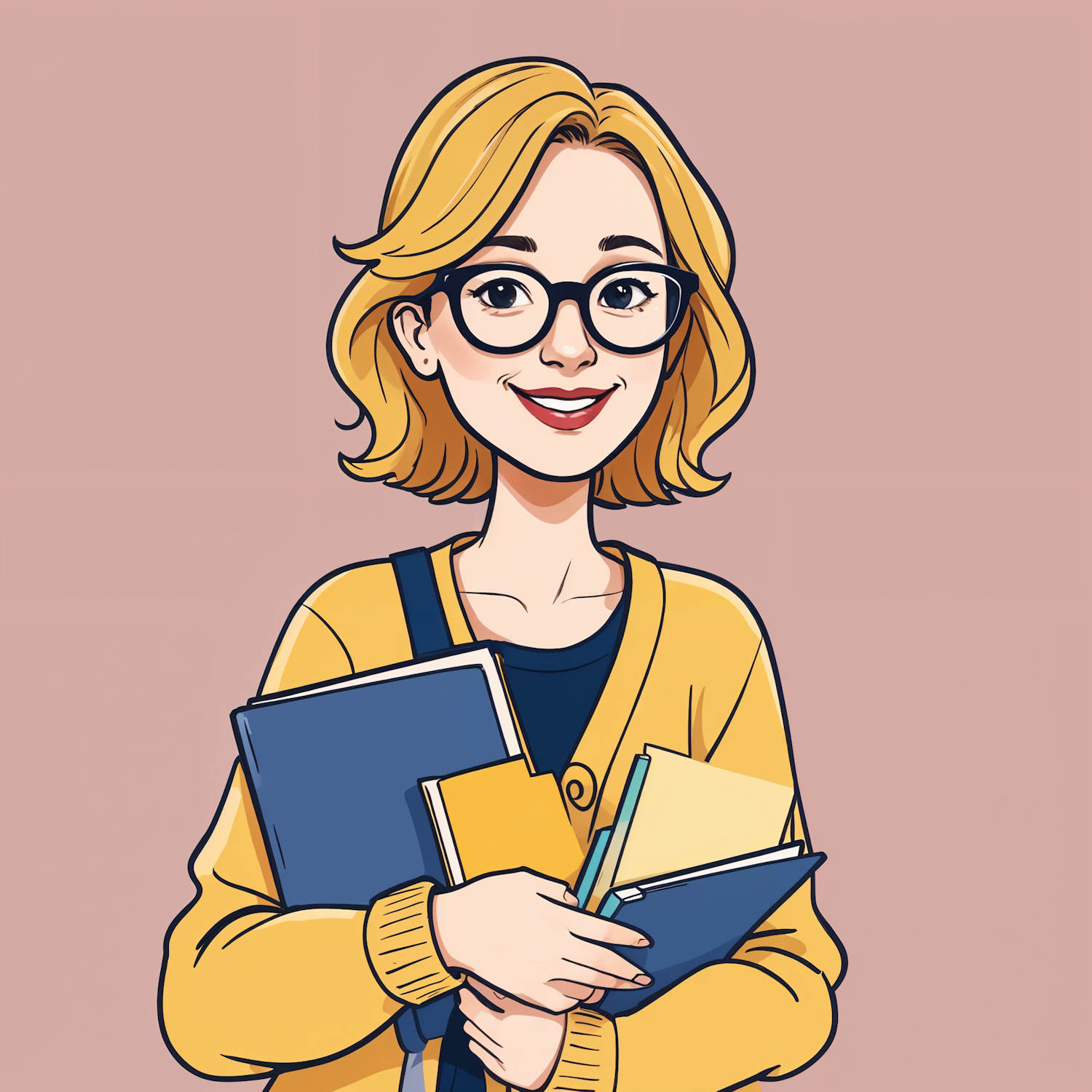 Illustration of a smiling woman with blonde hair, glasses, and a yellow cardigan, holding books against a pink background.