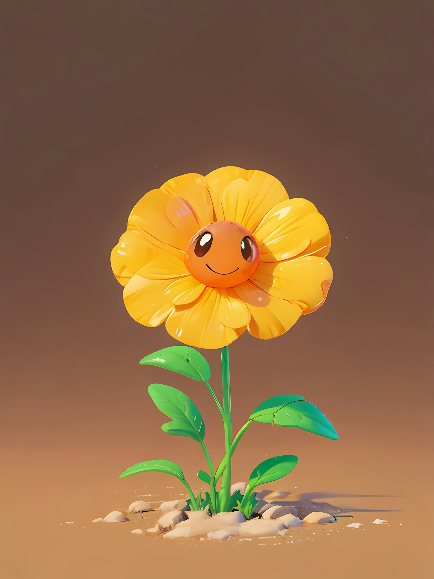 A cute yellow flower with a smiling face, glossy petals, and green leaves, set against a soft brown background. Whimsical and cheerful!