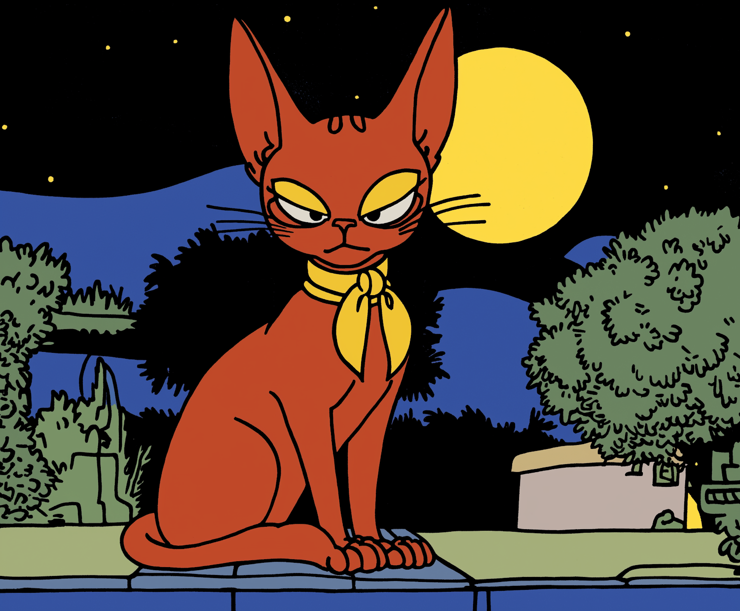 Stylized orange cat with yellow scarf under a full moon, surrounded by trees and a starry night sky. Whimsical and serene illustration.