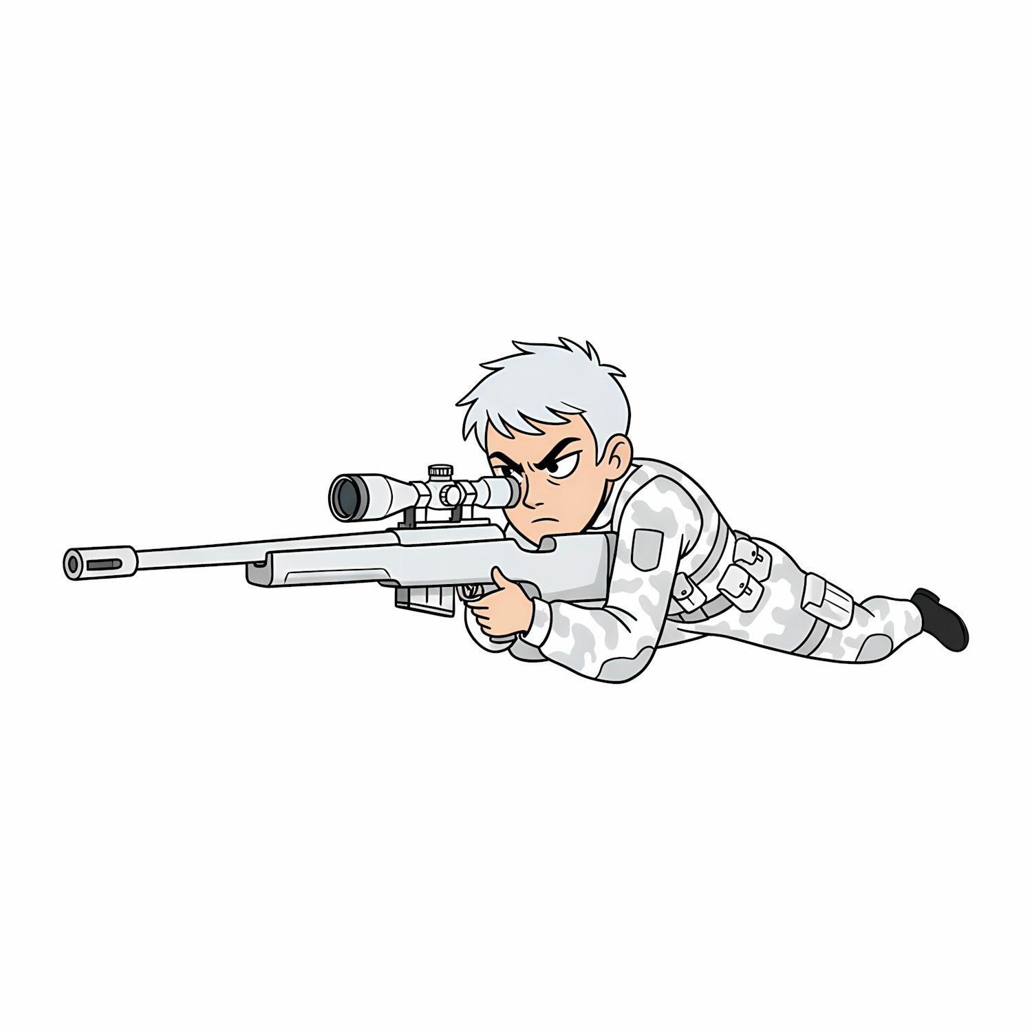 Cartoon soldier in white camouflage aiming a sniper rifle, showcasing a determined expression and detailed weaponry.